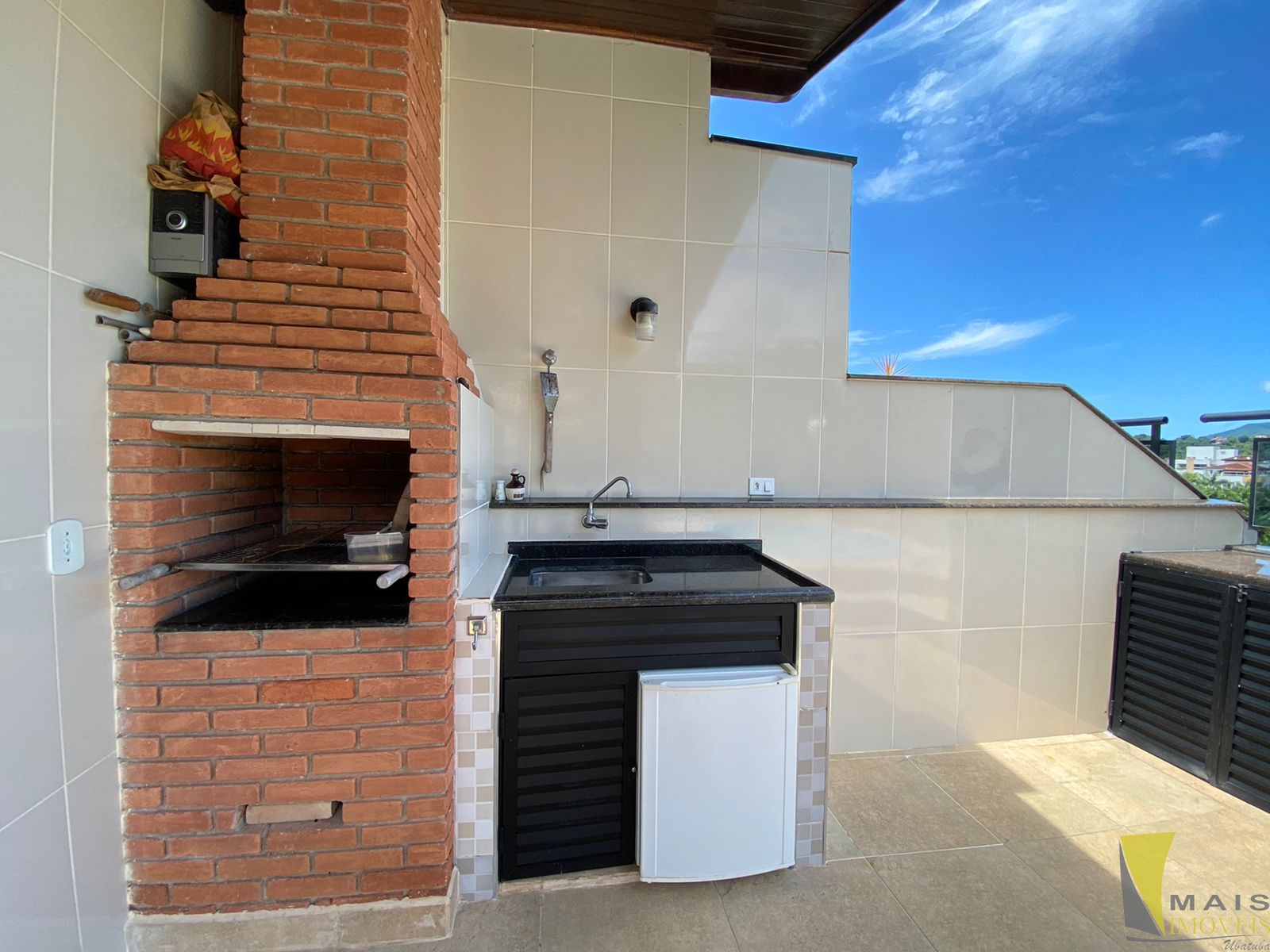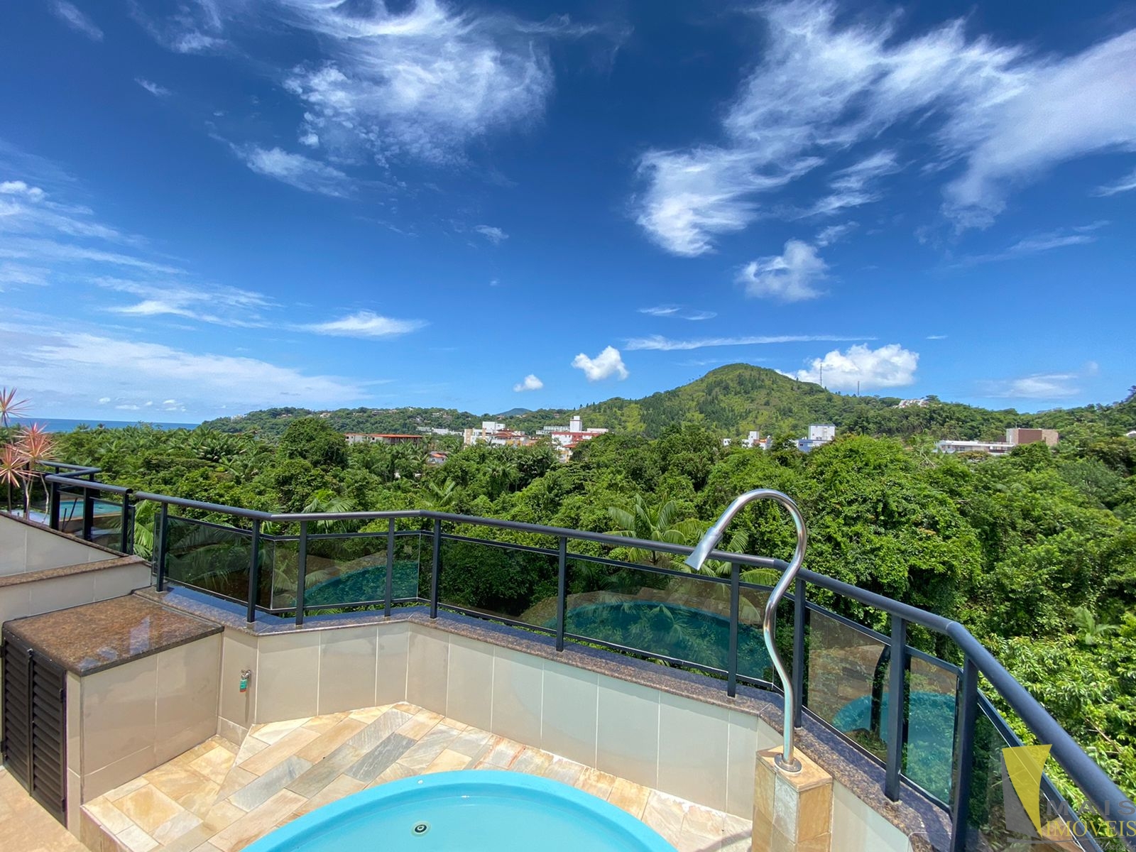 Na parte de cima, um quarto, um banheiro, uma sala com entrada separada do ambiente de baixo, depósito, churrasqueira e área gourmet com piscina. Tudo isso com uma linda vista para os morros e mar.