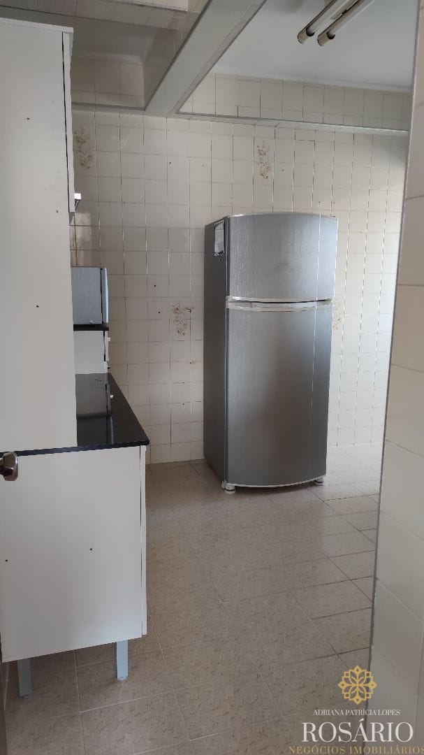 Cozinha com armário, geladeira e fogão;