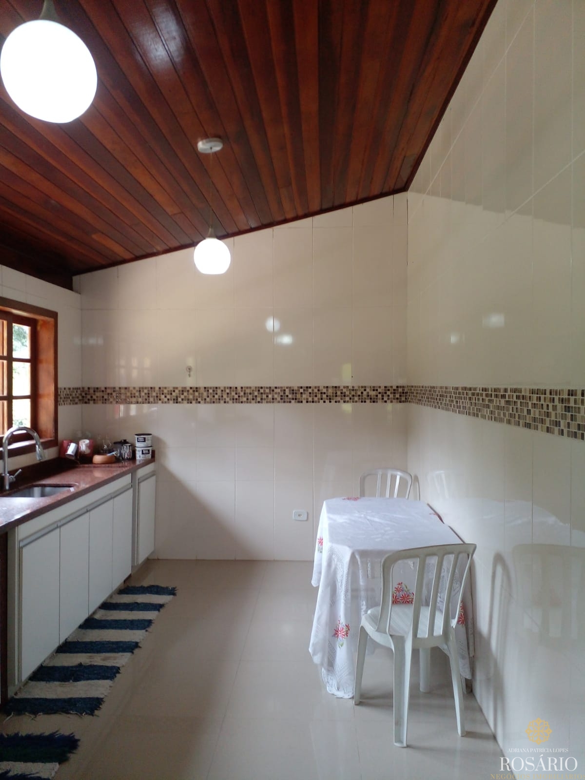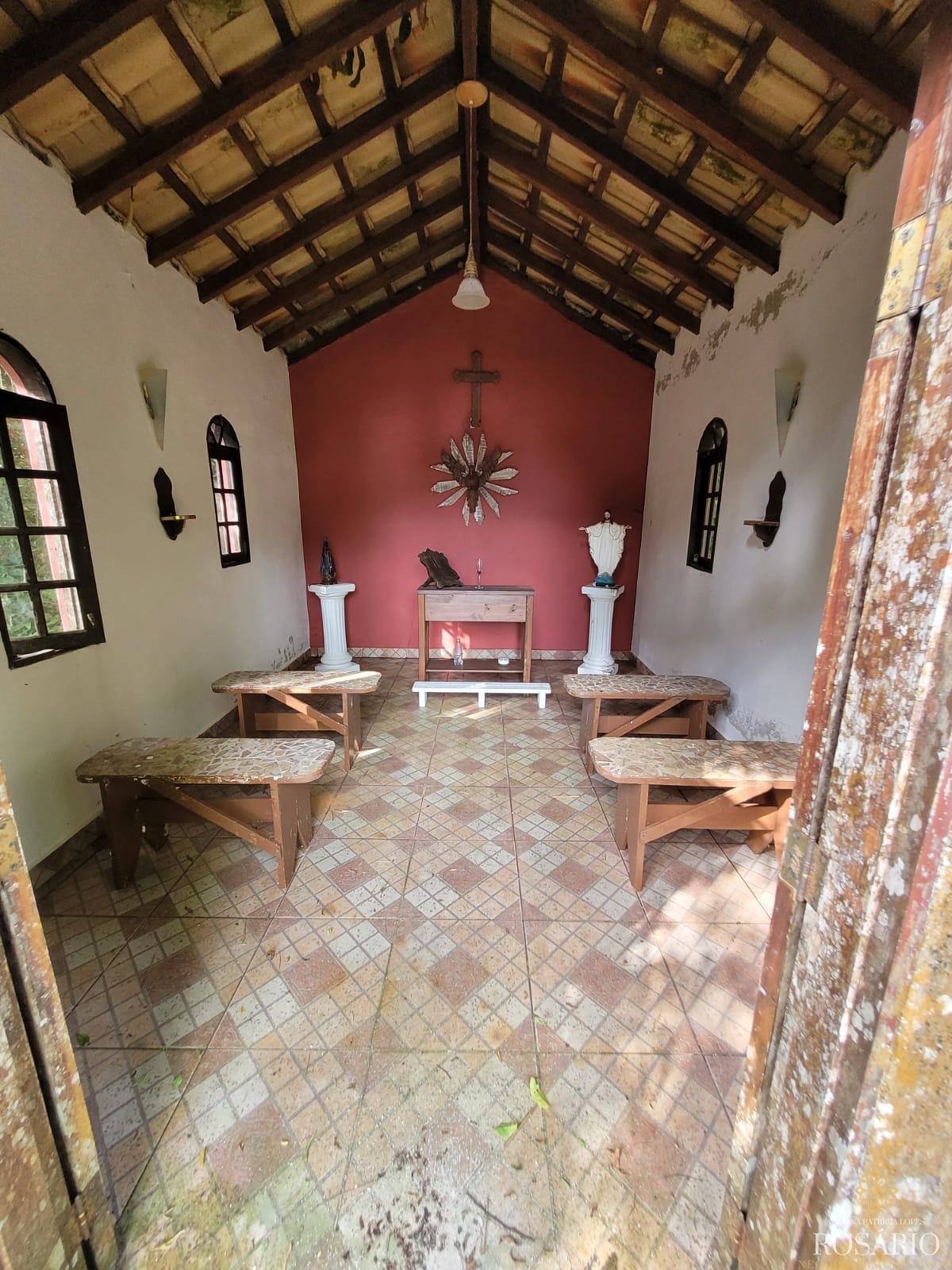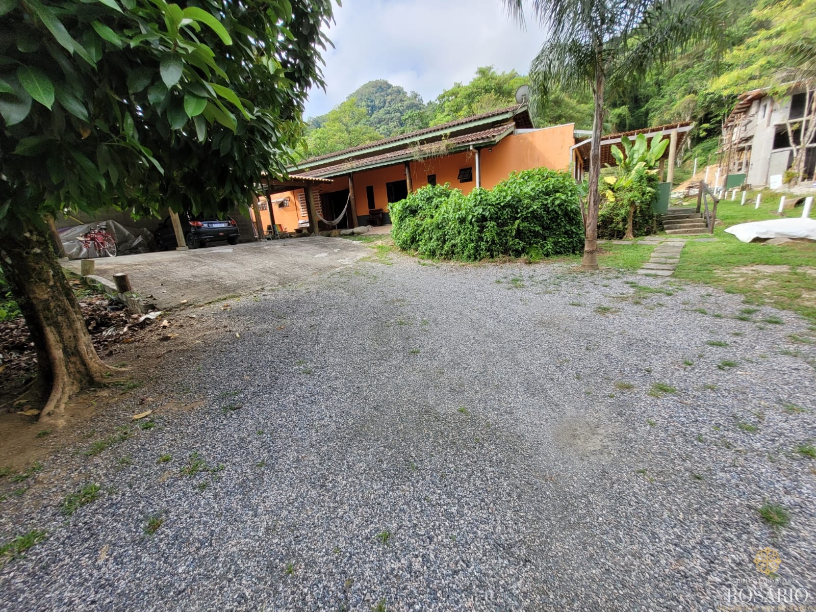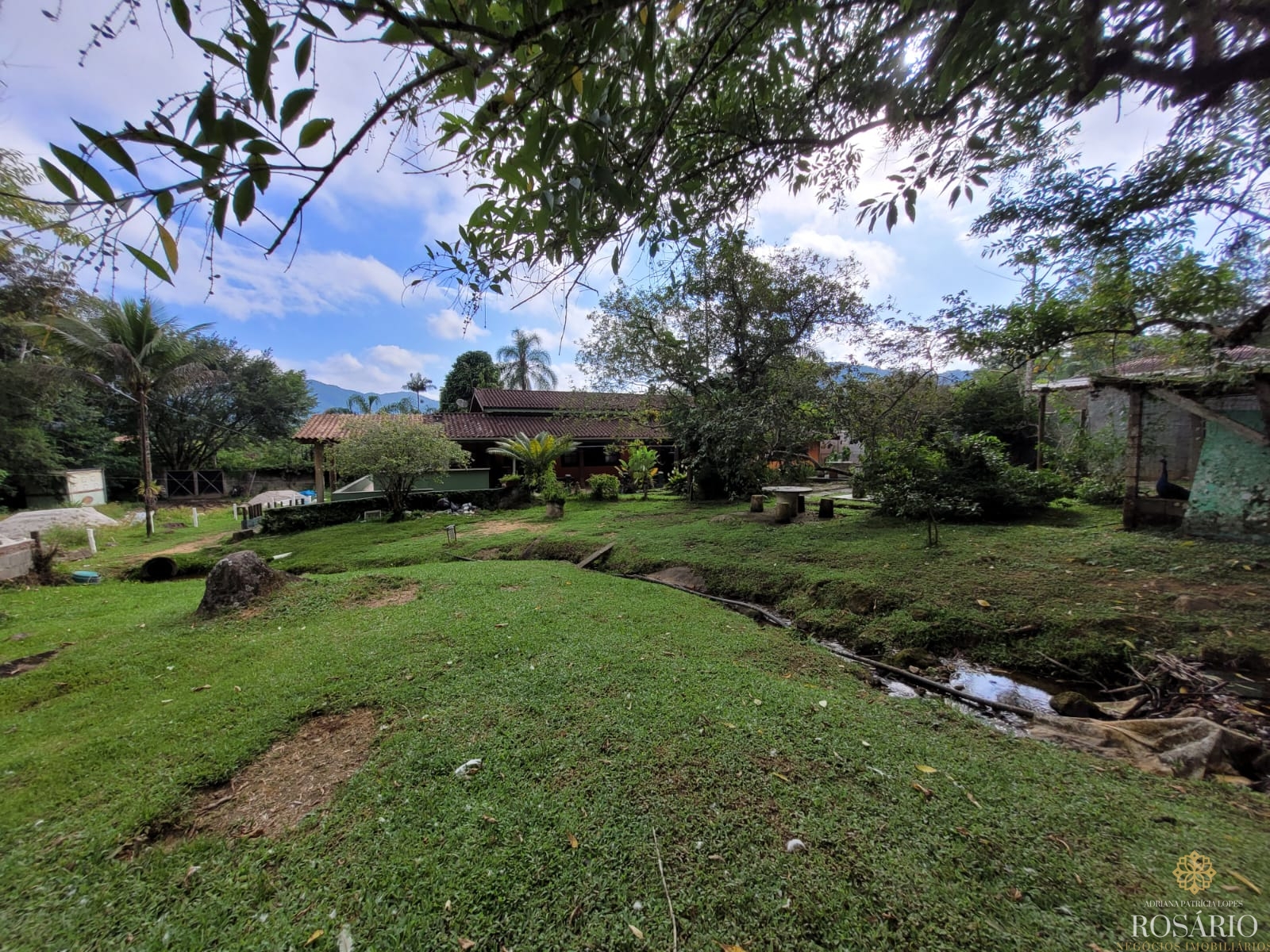 Possui 2 dormitórios, sendo 1 suíte com mezanino e 1 dormitório com closet e jacuzzi, 1 banheiro social, garagem coberta com espaço para 3 veículos. Este imóvel também tem sala de jantar, sala de estar, cozinha vista ampla com armários, cooktop e televisão, varanda ampla com churrasqueira, portão eletrônico, água da nascente ou encanada e nos fundos uma capela. Jardim majestoso com árvores frutíferas, nascente e animais exóticos como: pavão, gansos e galinhas.