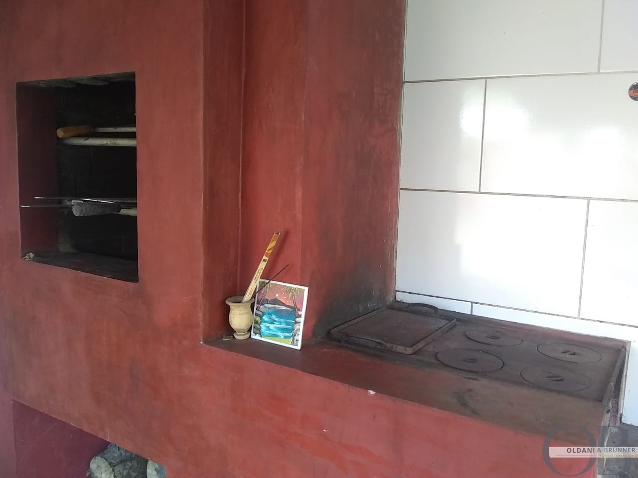 Varanda gourmet completa com churrasqueira, fogão e pia