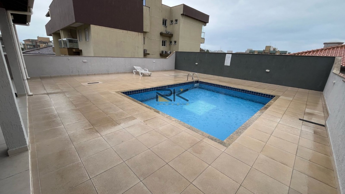 Área de lazer com piscina e espaço para festas.