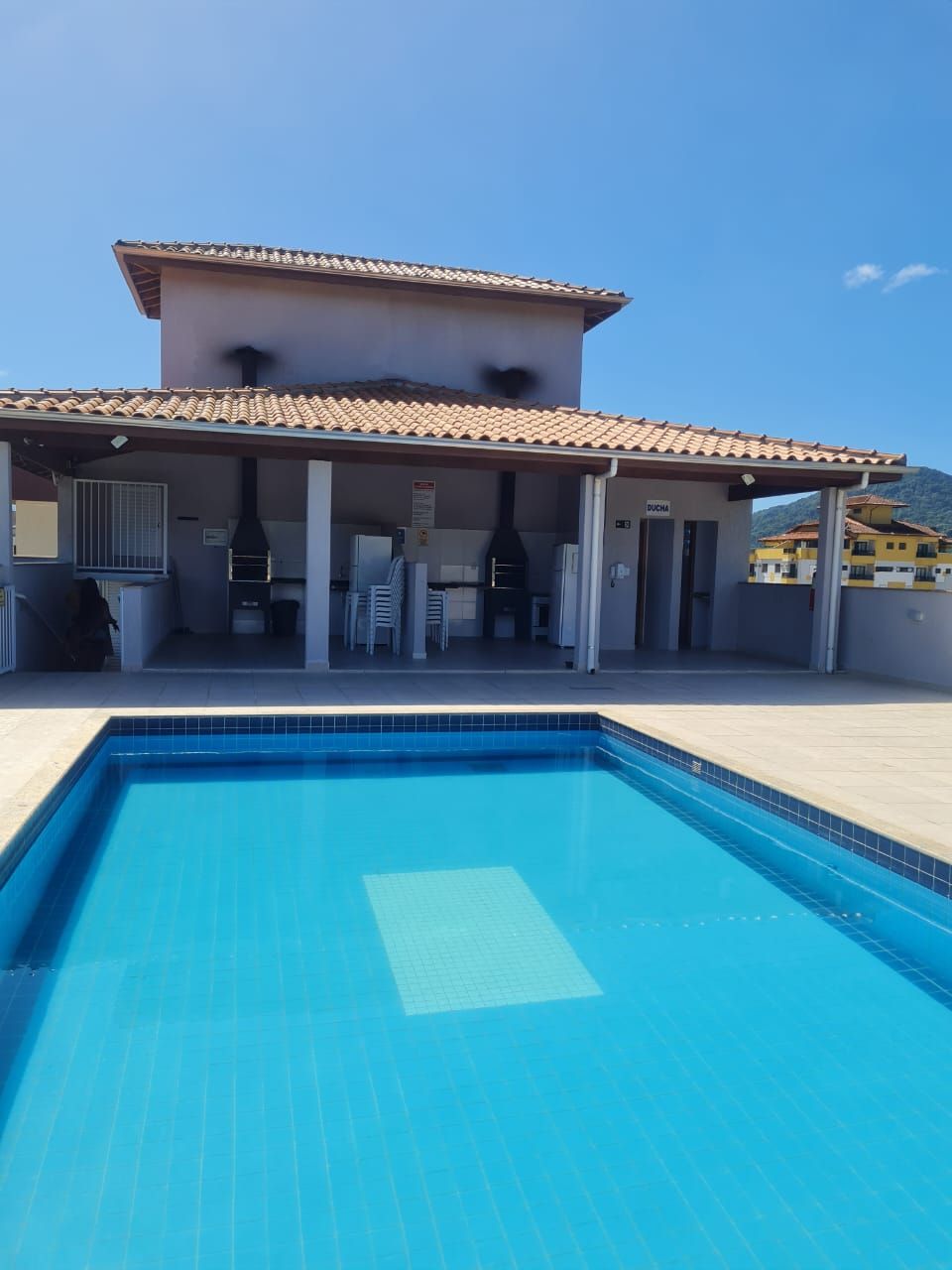 O condominio tem uma área de lazer no terraço, com piscina e churrasqueiras.