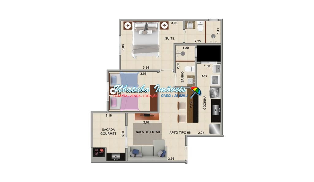 varanda gourmet, sala 2 ambientes, cozinha americana, banheiro social, 2 dormitórios sendo 1 suíte.