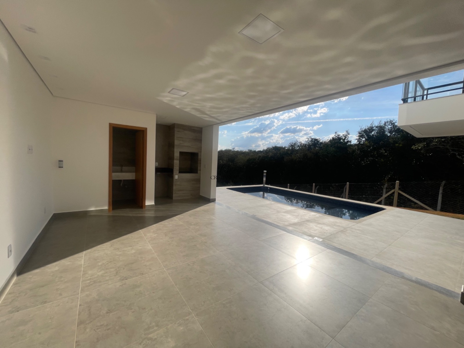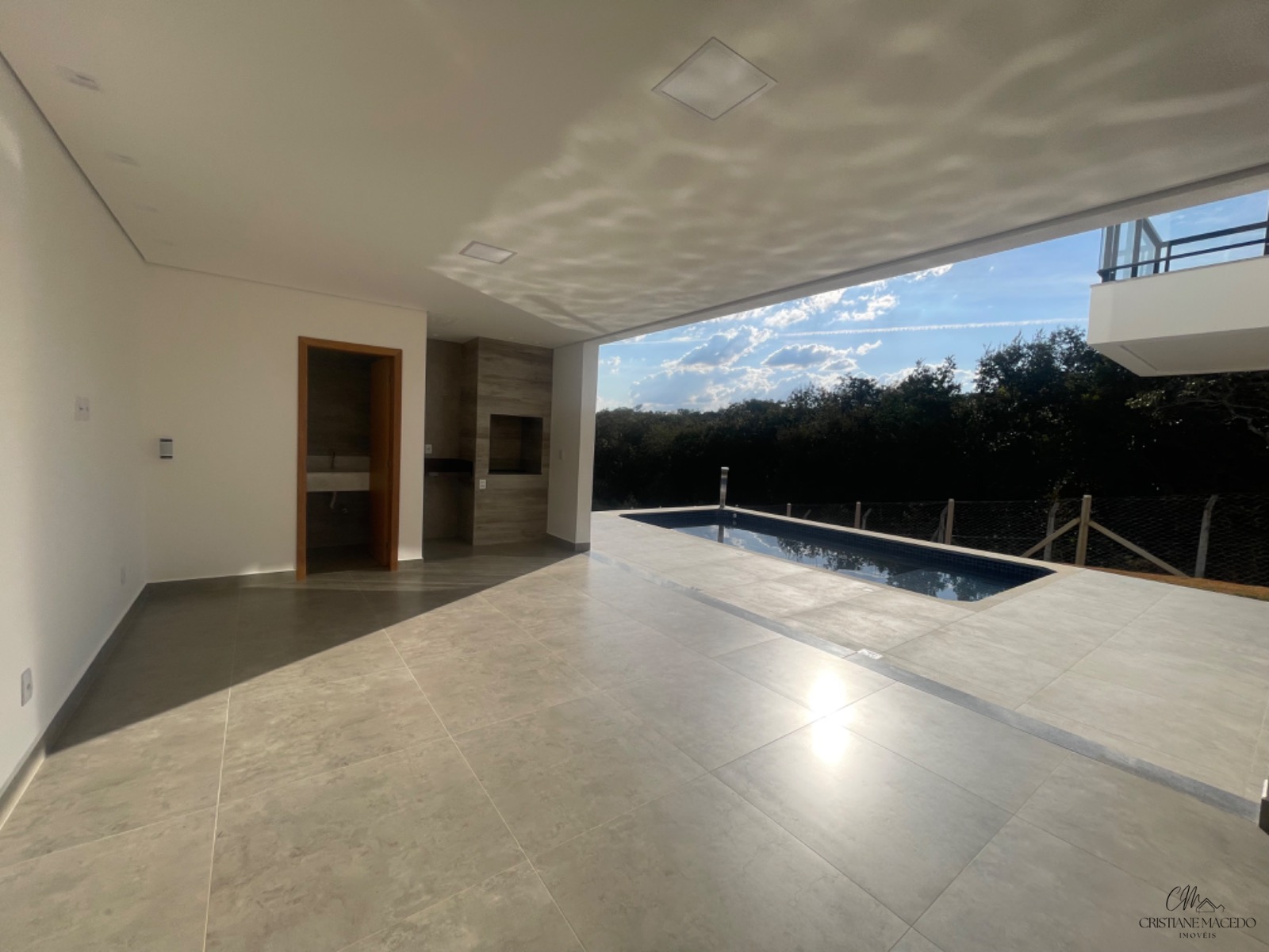 Lazer com piscina, espaço gourmet com churrasqueira e banho de apoio.