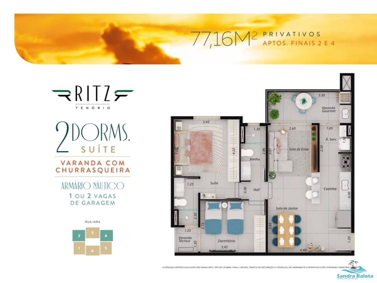 Possui 2 dormitórios sendo 1 suíte, 2 banheiros (sendo 1 da suíte), 1 garagem.