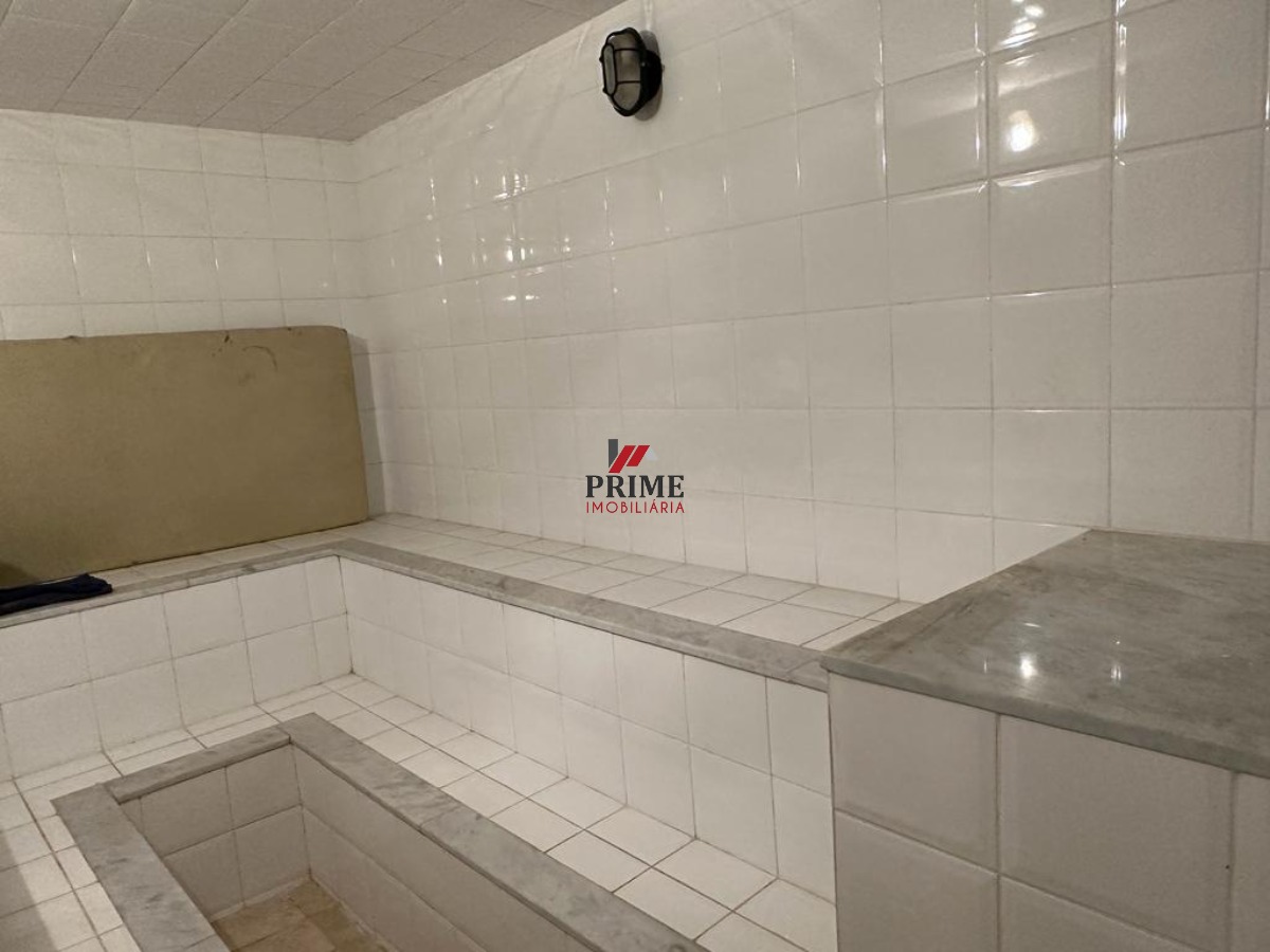 uma Garagem coberta para dois veículos, anexa ao espaço gourmet completo, churrasqueira, bancada em granito para pia, banheiro de apoio, quarto de despejo, reversível, uma enorme Sauna, com chuveirão.