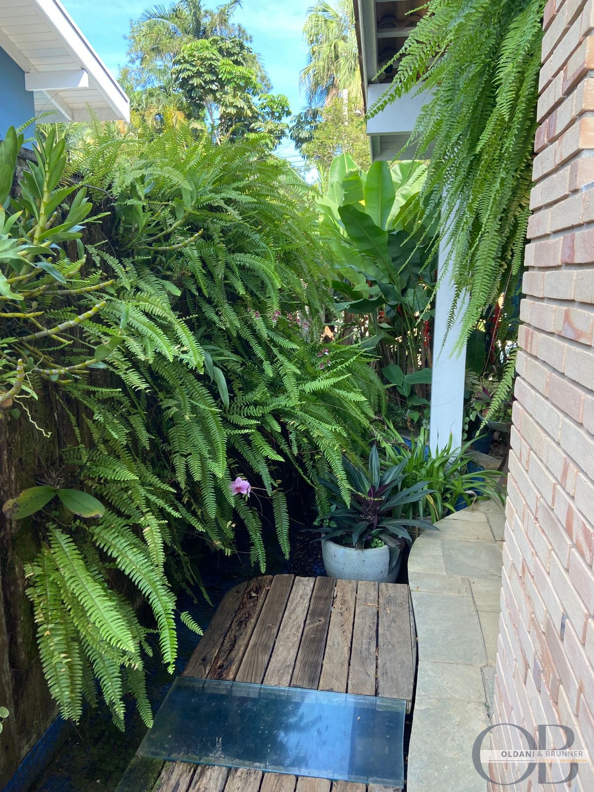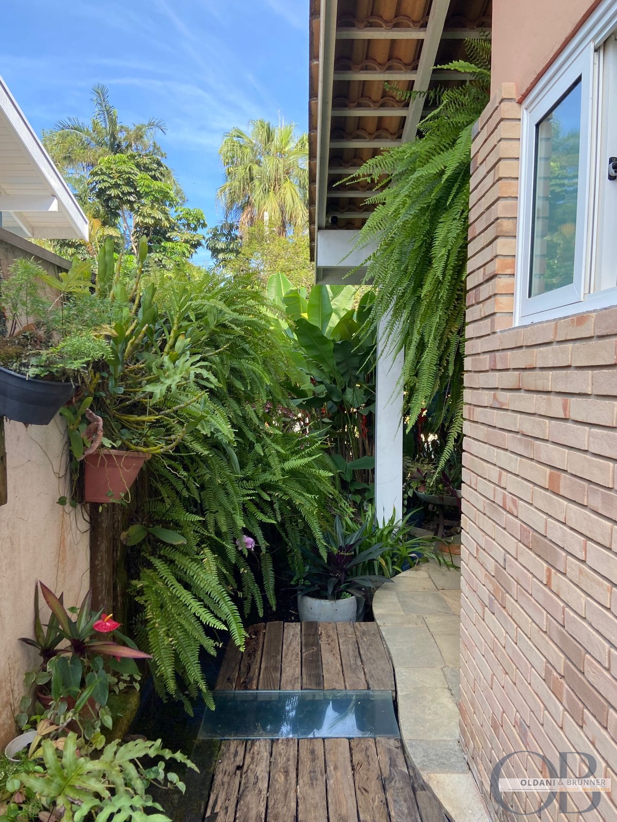Laguinho decorativo com fonte de água corrente, deck em madeira de demolição e vidro