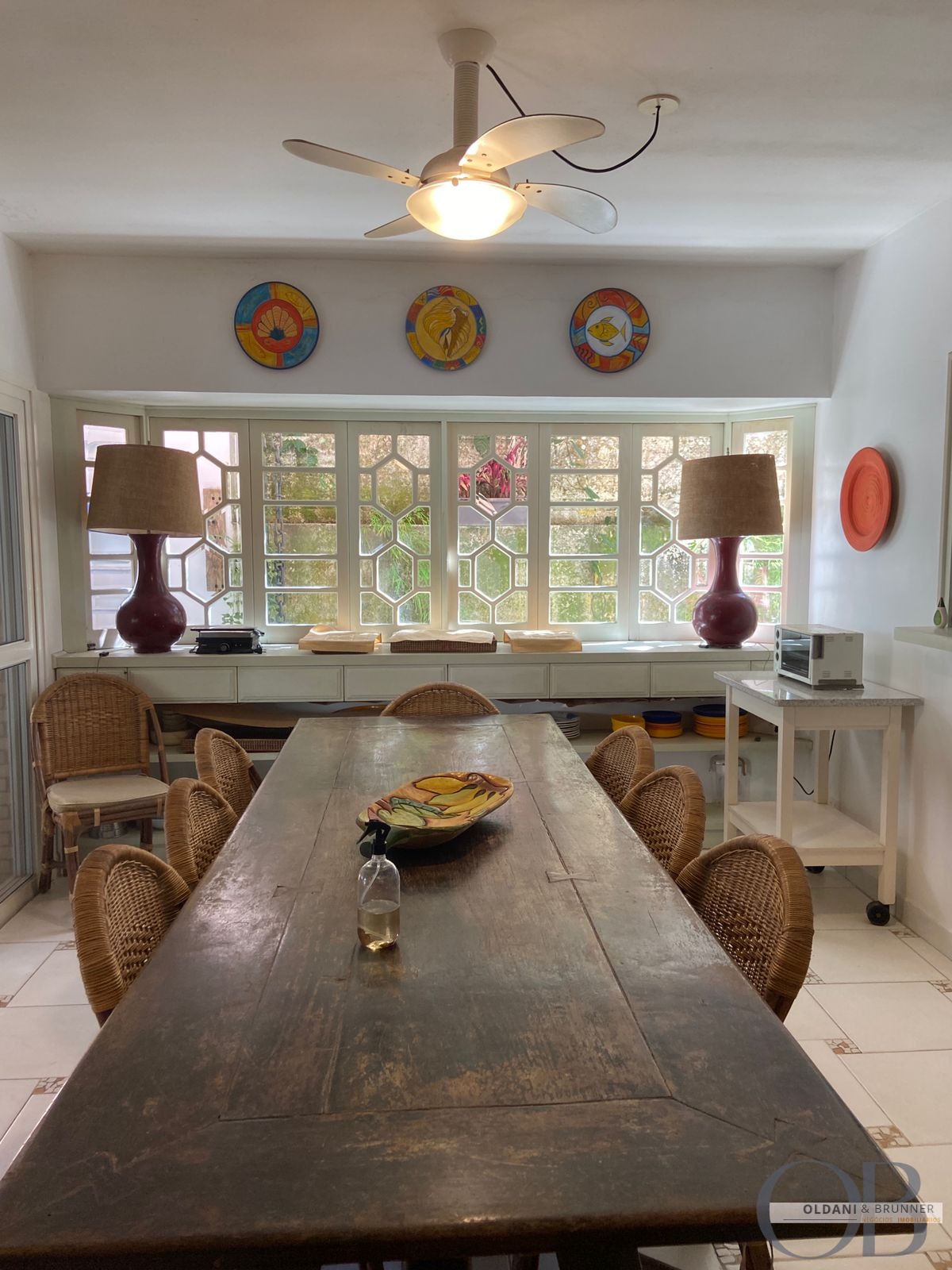 Sala de jantar com aparador e janelas com vidros bisotados