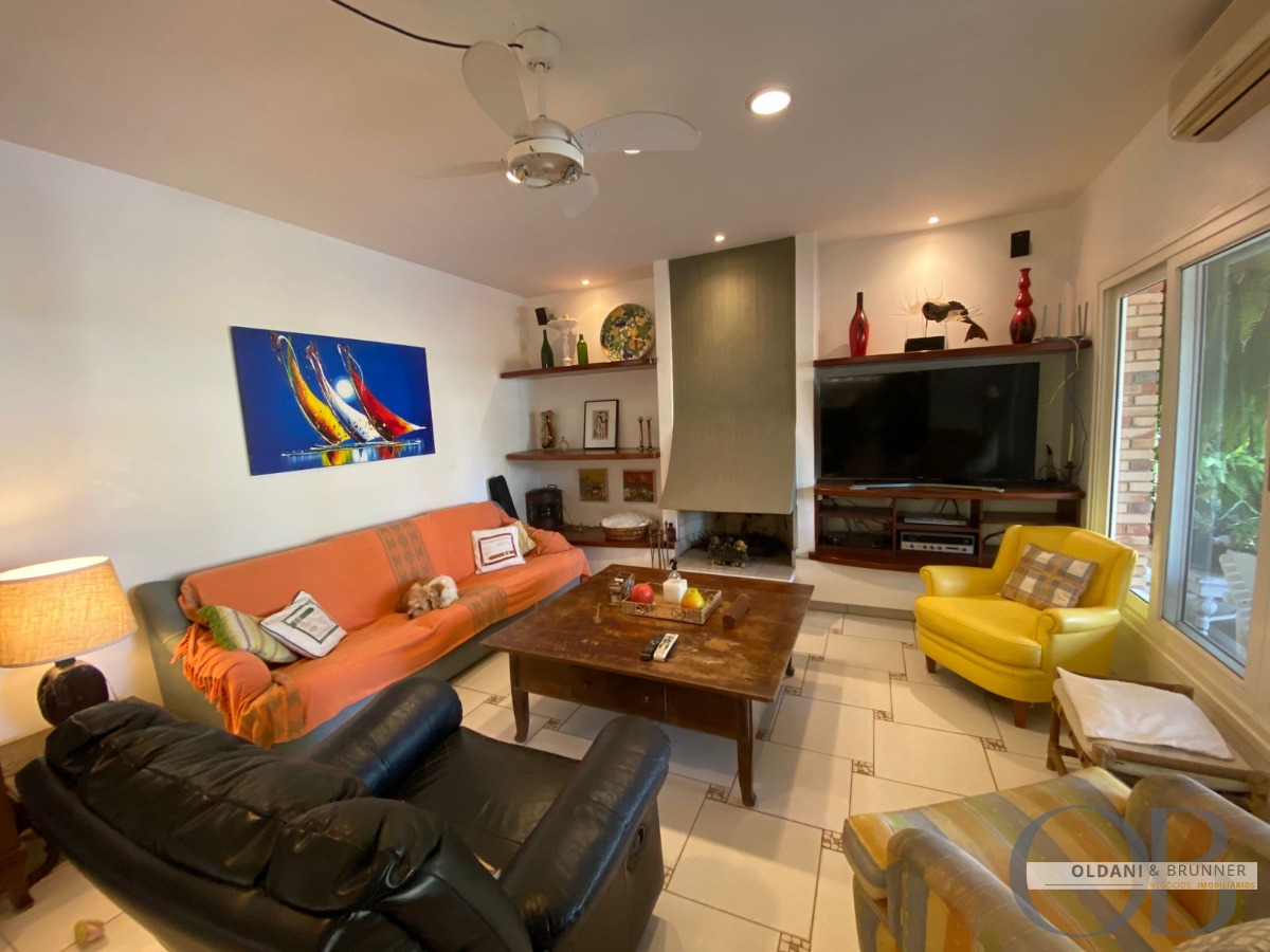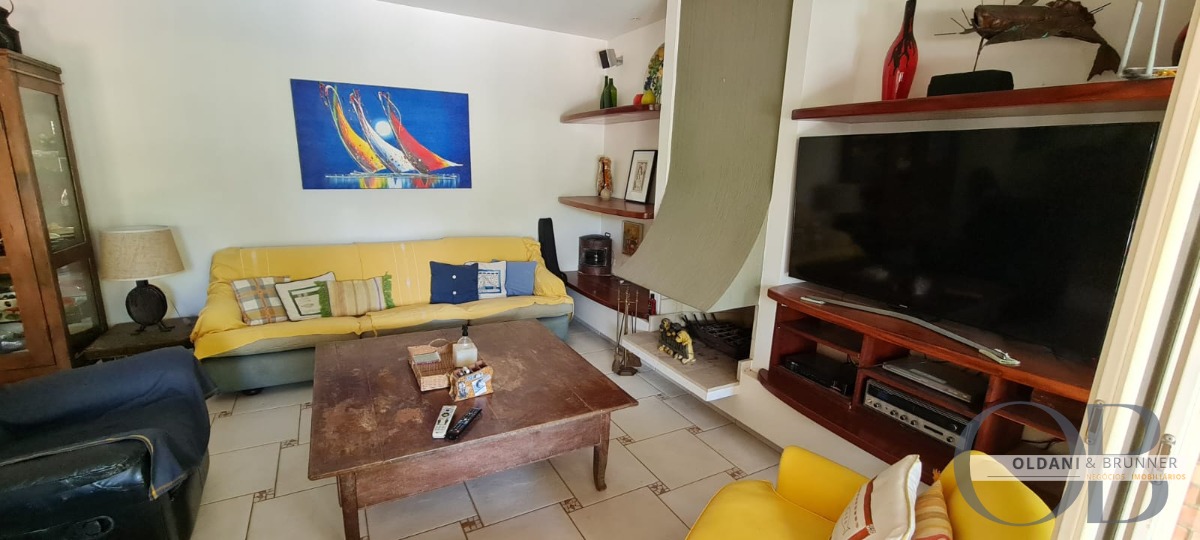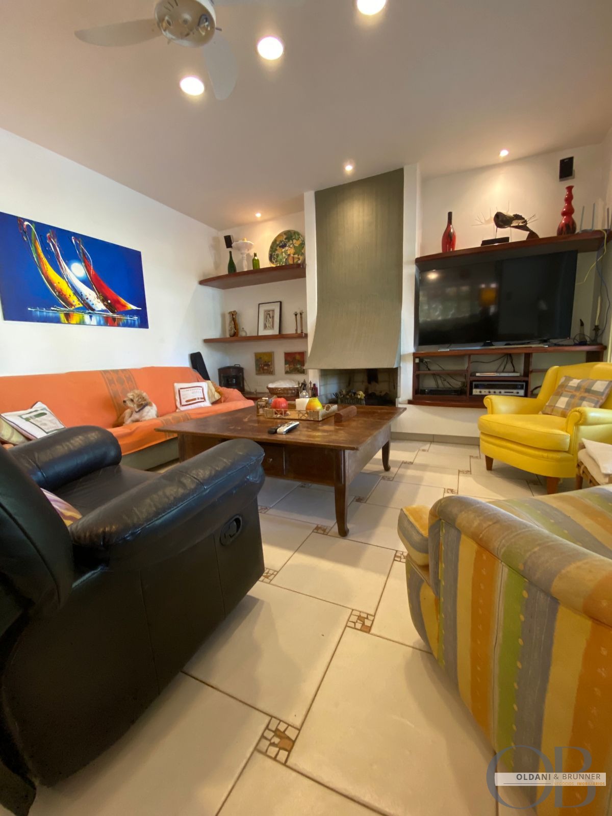 Sala de estar ampla com lareira e TV