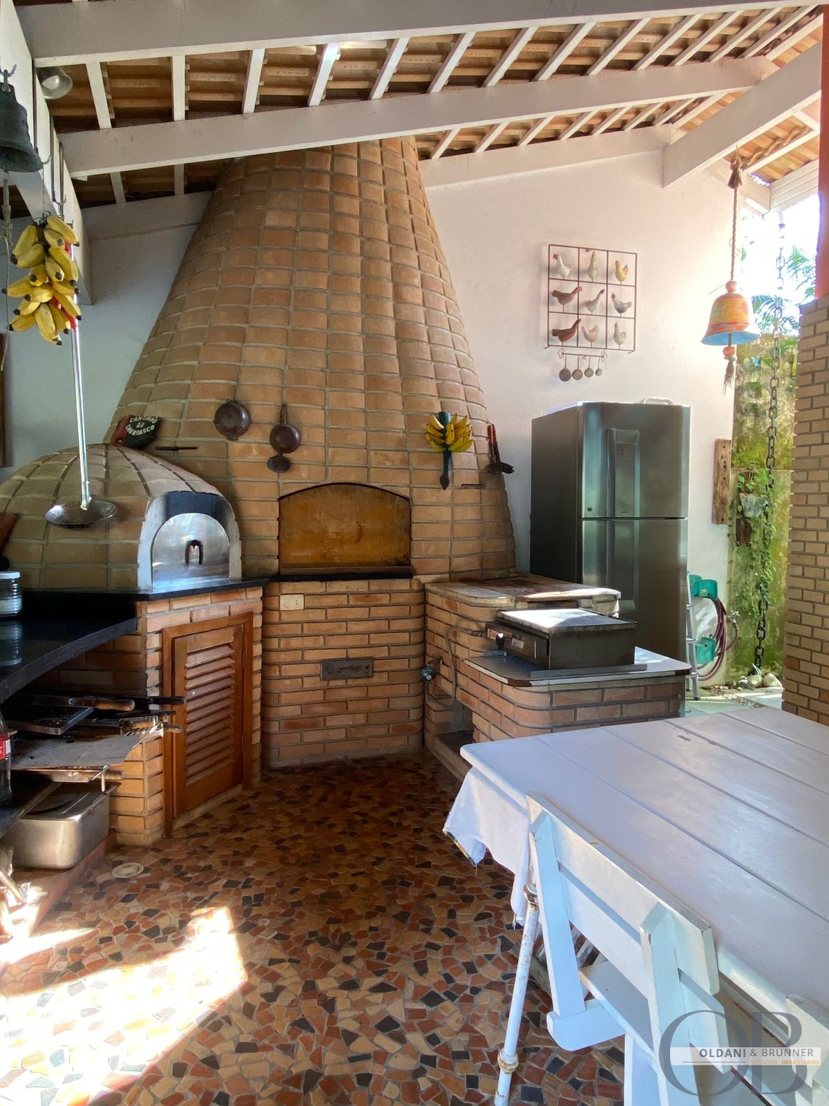 Varanda gourmet completa com churrasqueira, forno de pizza, fogão a lenha e bancada de pedra com pia