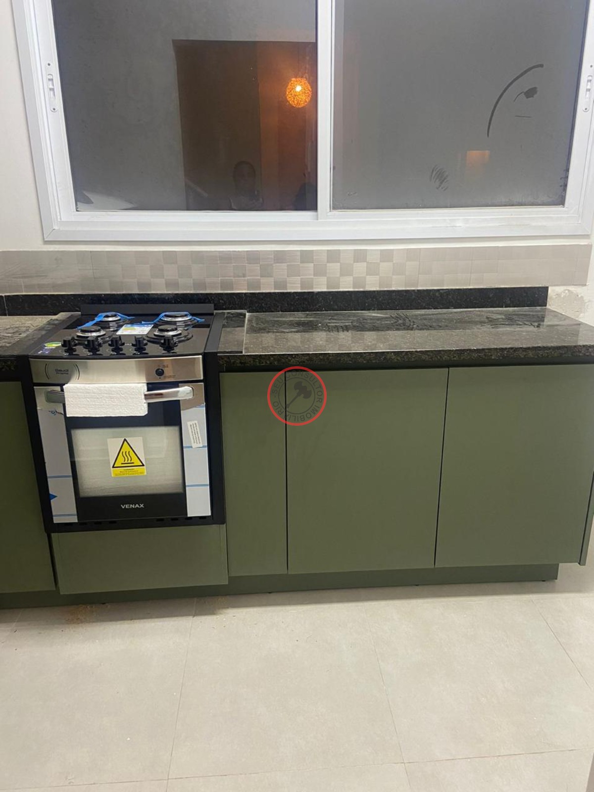 Este imóvel também tem sala de estar, varanda, cozinha, armários de cozinha, despensa