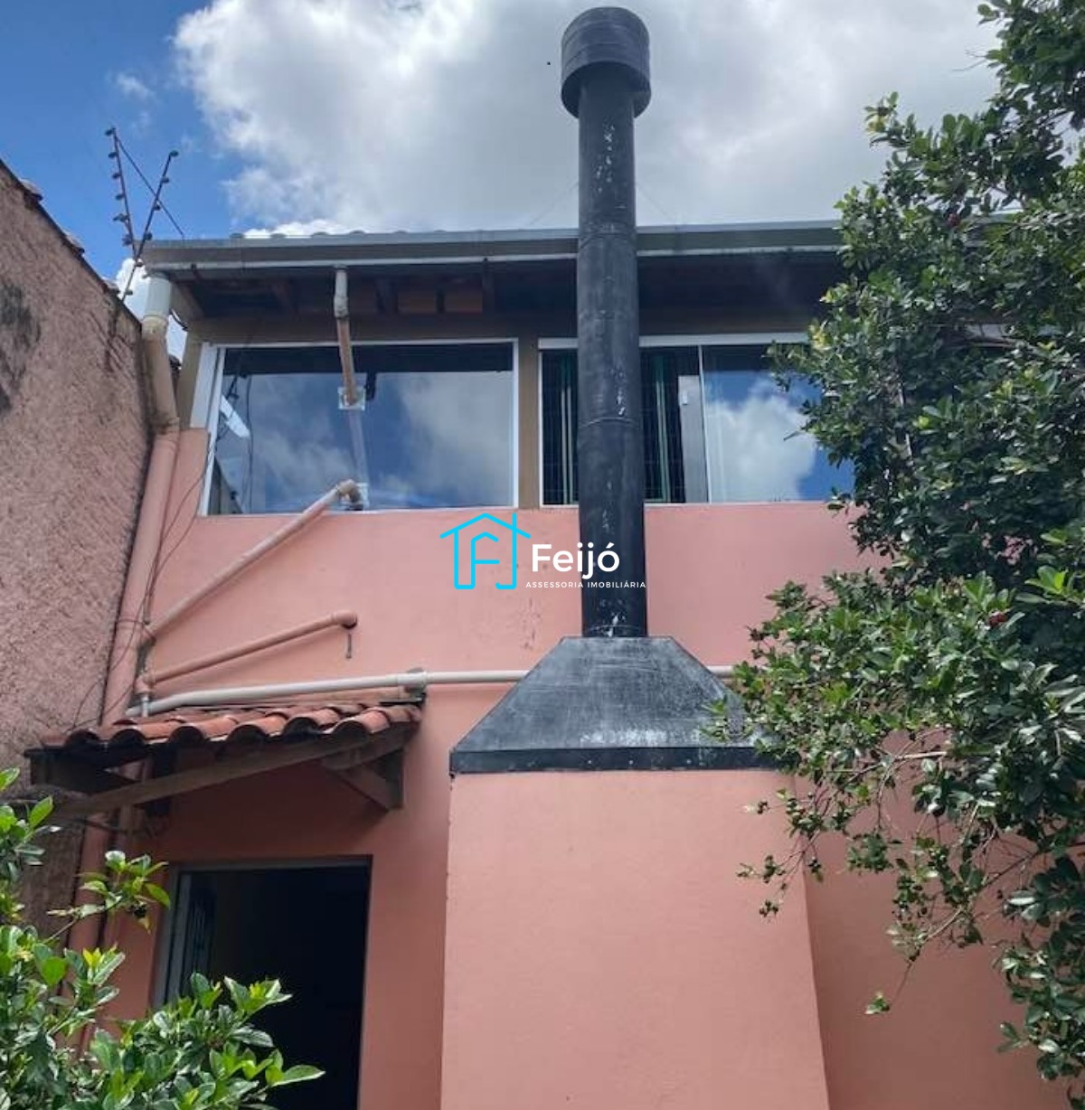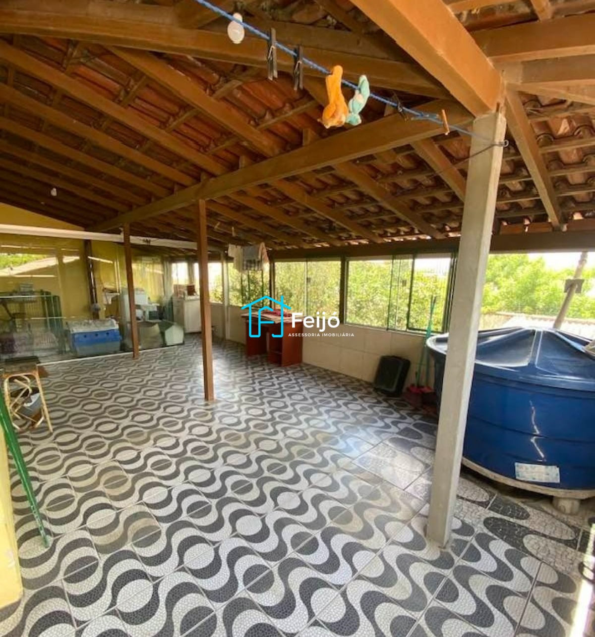 - 2 dormitórios no segundo piso, sala de estar, 1 banheiro, grande área coberta com janelas de vidro e reservatório de água (imóvel também conta com uma cisterna), jardim de inverno