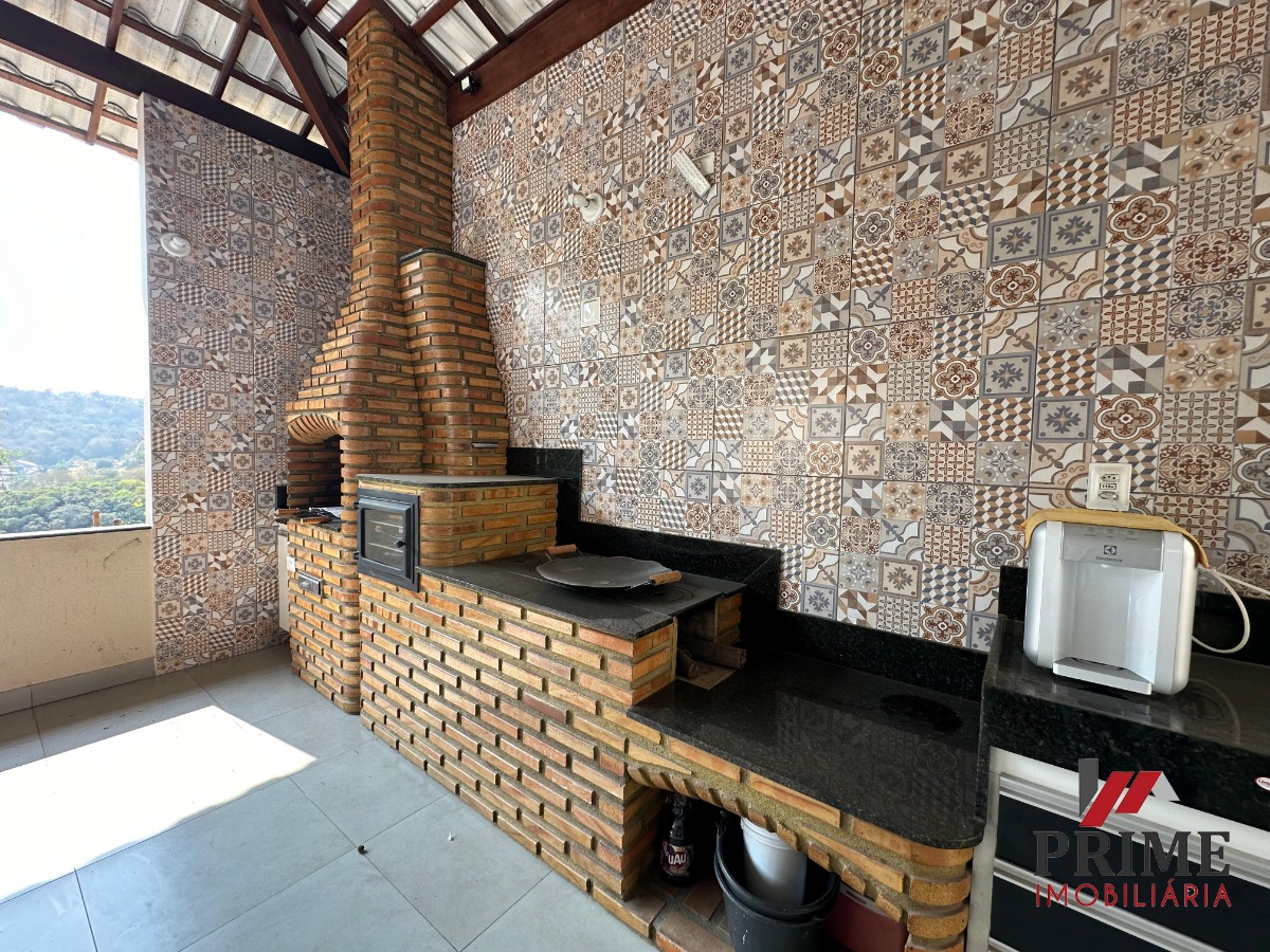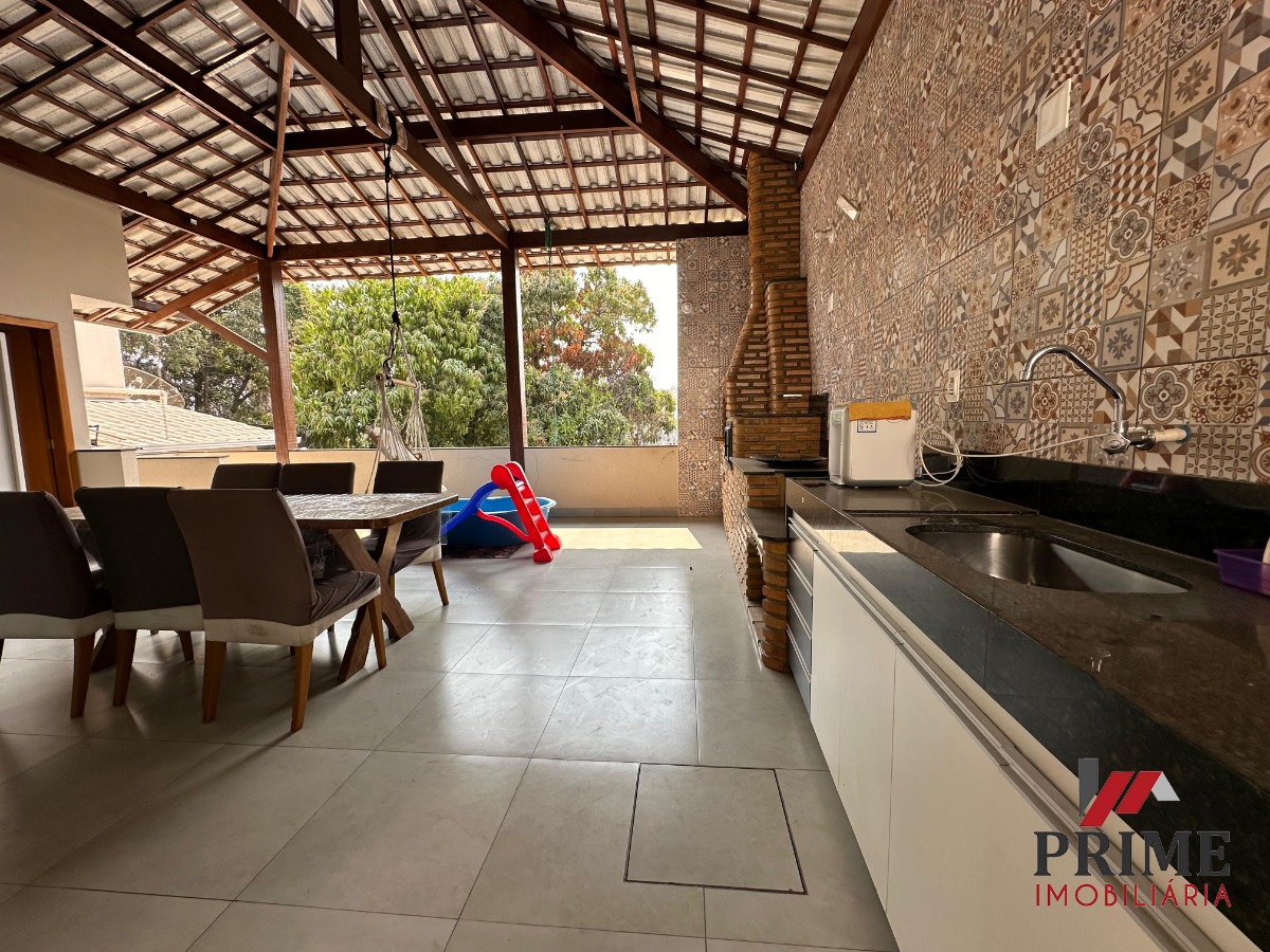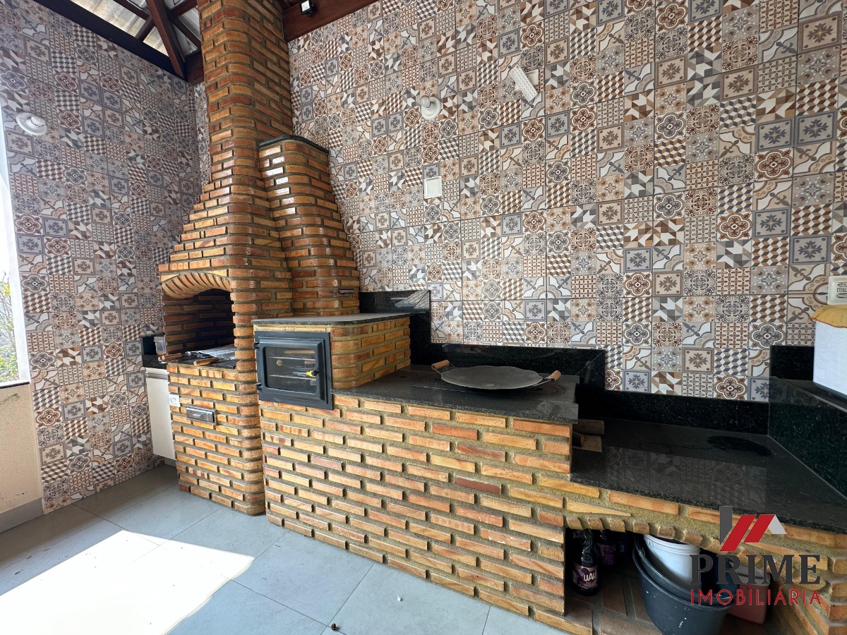 Varanda Gourmet super espaçosa com churrasqueira, armários, fogão à lenha, forno e bancadas, área de serviço, garagem.
