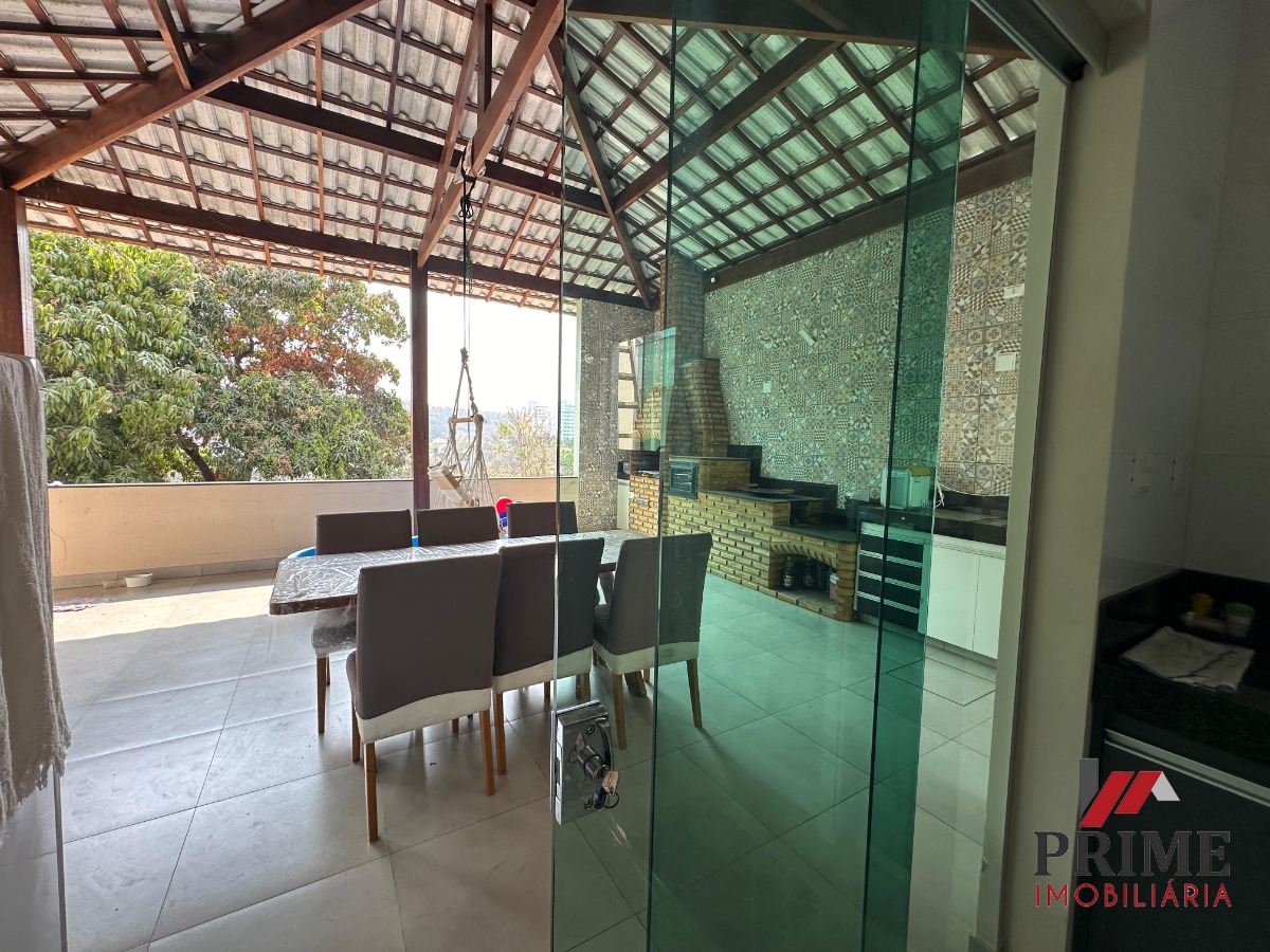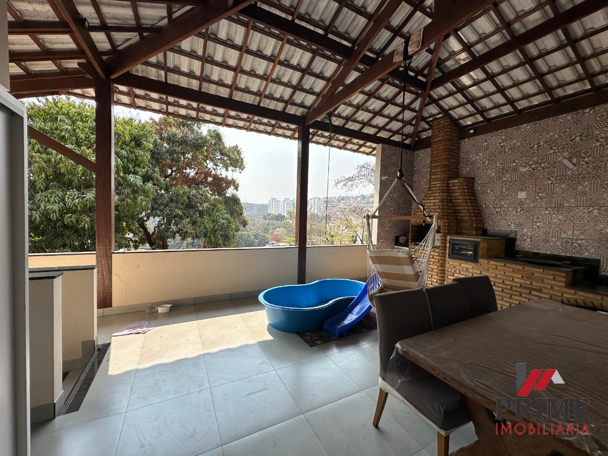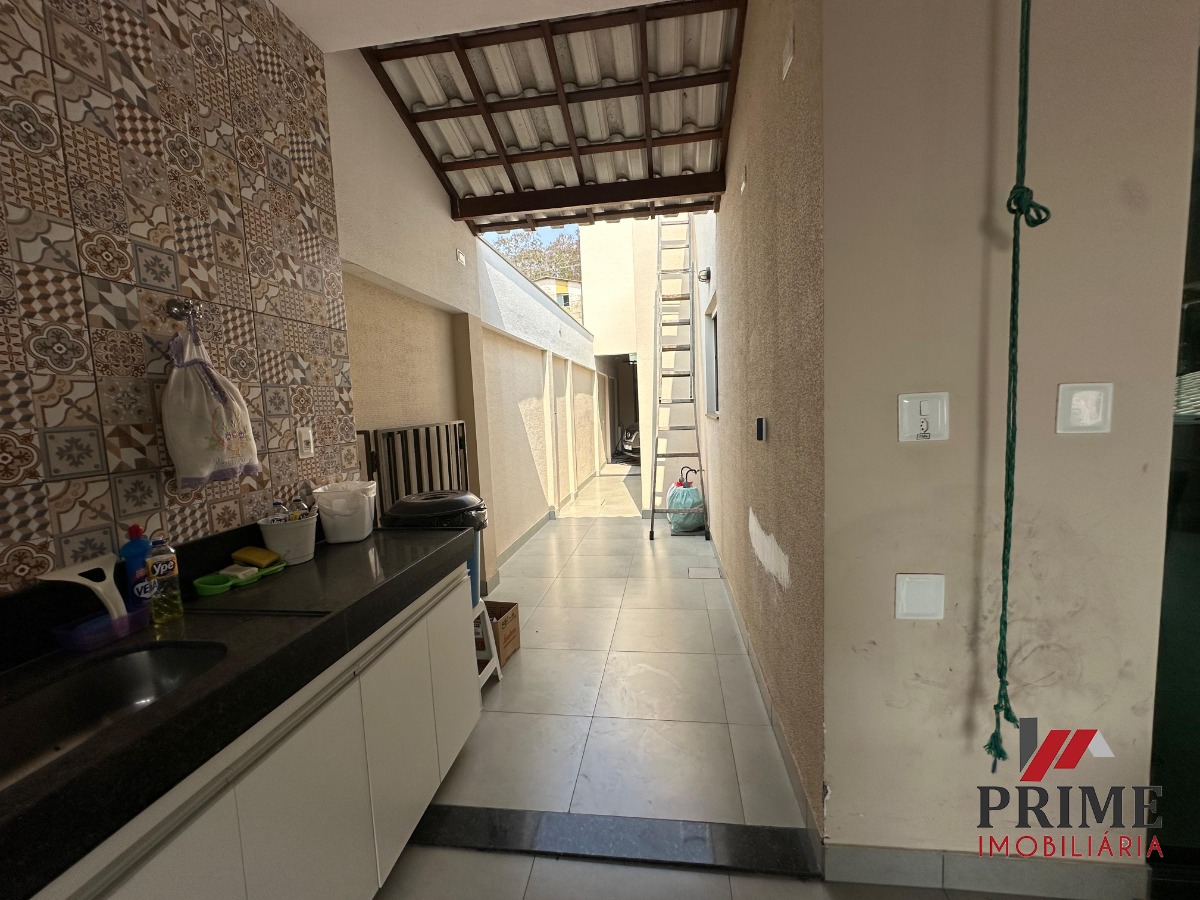 Varanda Gourmet super espaçosa com churrasqueira, armários, fogão à lenha, forno e bancadas, área de serviço, garagem.