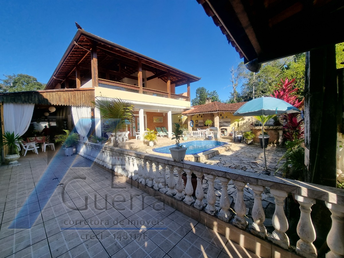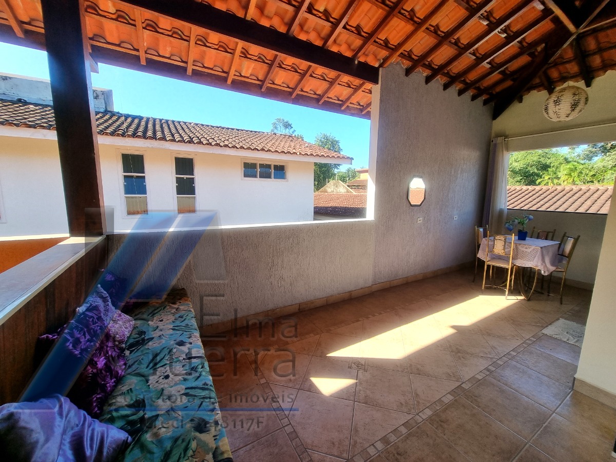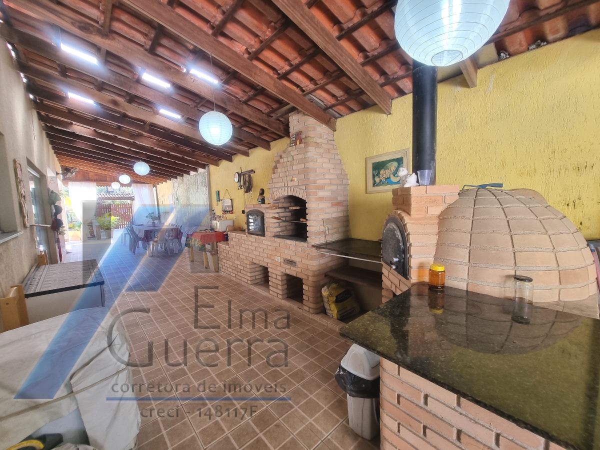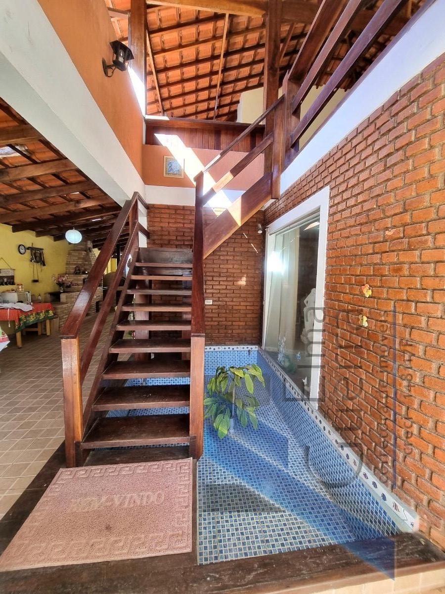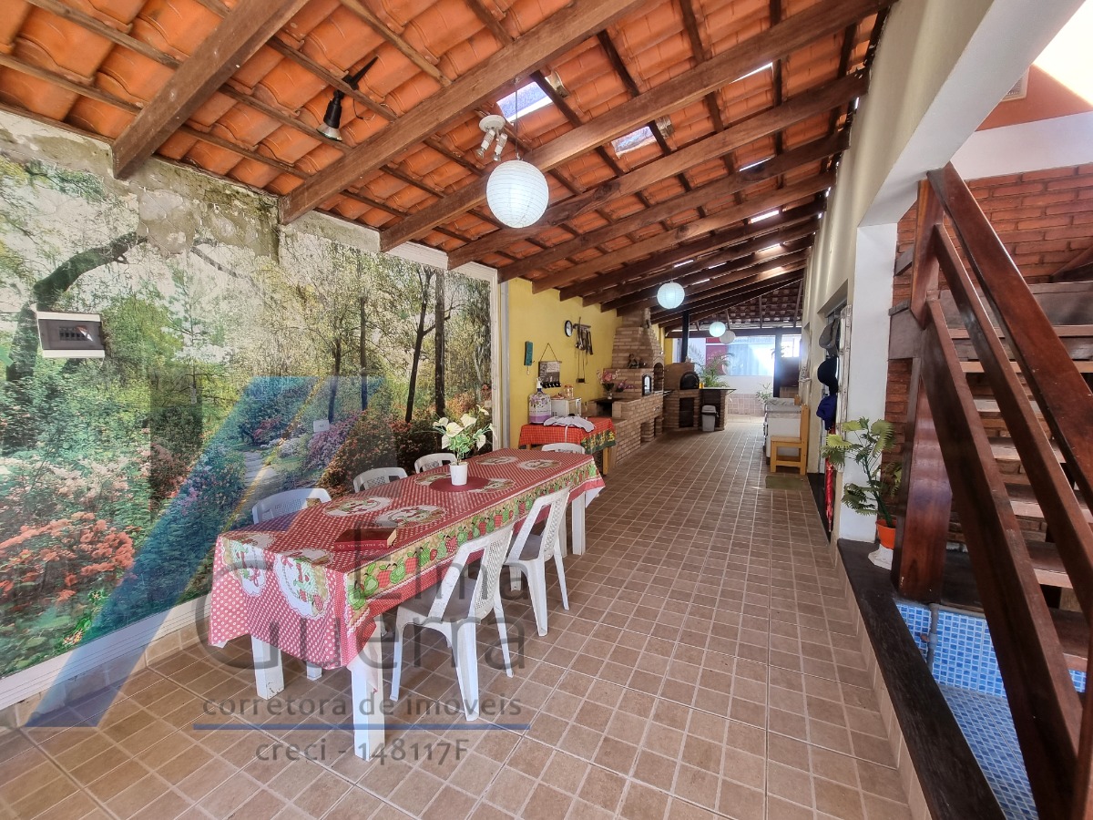 Constituida c/ 6 suítes, mezanino, ampla sala com 3 ambientes, banheiro social, cozinha, area de serviço, jardim, quintal, e 03 vagas de garagem, 02 ranchos com churrasqueira e fogão a lenha, piscina.