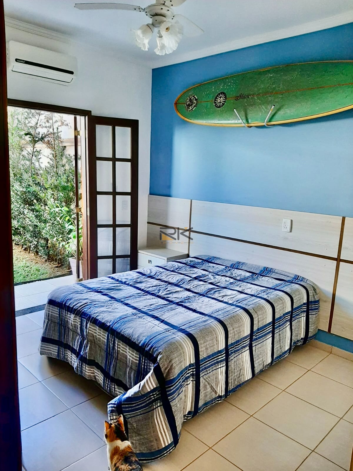 A casa em Ubatuba, na praia das Toninhas, fica a 250 metros do mar e está completamente mobiliada com móveis planejados. Possui 4 suítes, cada uma equipada com ar condicionado, ventilador e camas. Além das suítes, há 2 banheiros sociais na casa.