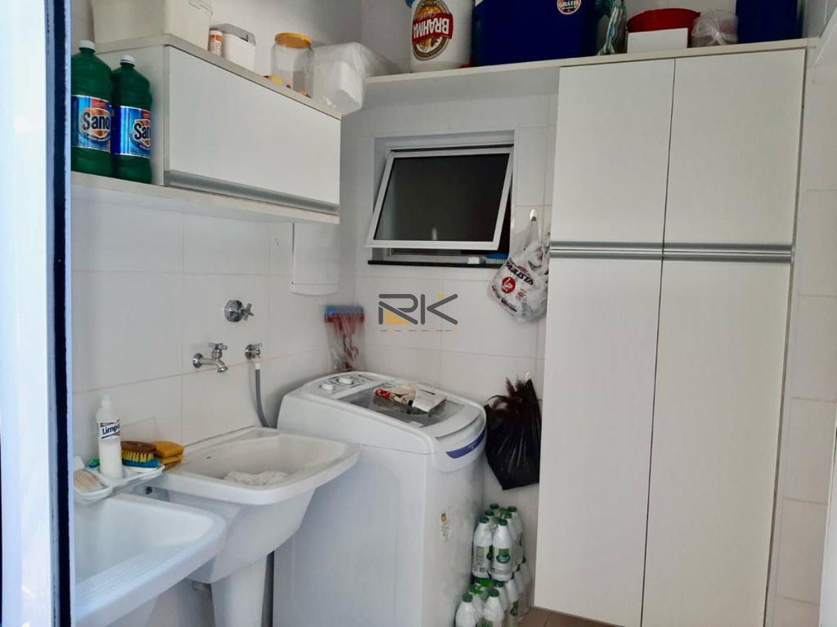 A cozinha também é planejada e inclui geladeira, fogão e micro-ondas. A sala está completa com todos os móveis, excluindo apenas as TVs e outros aparelhos eletrônicos.