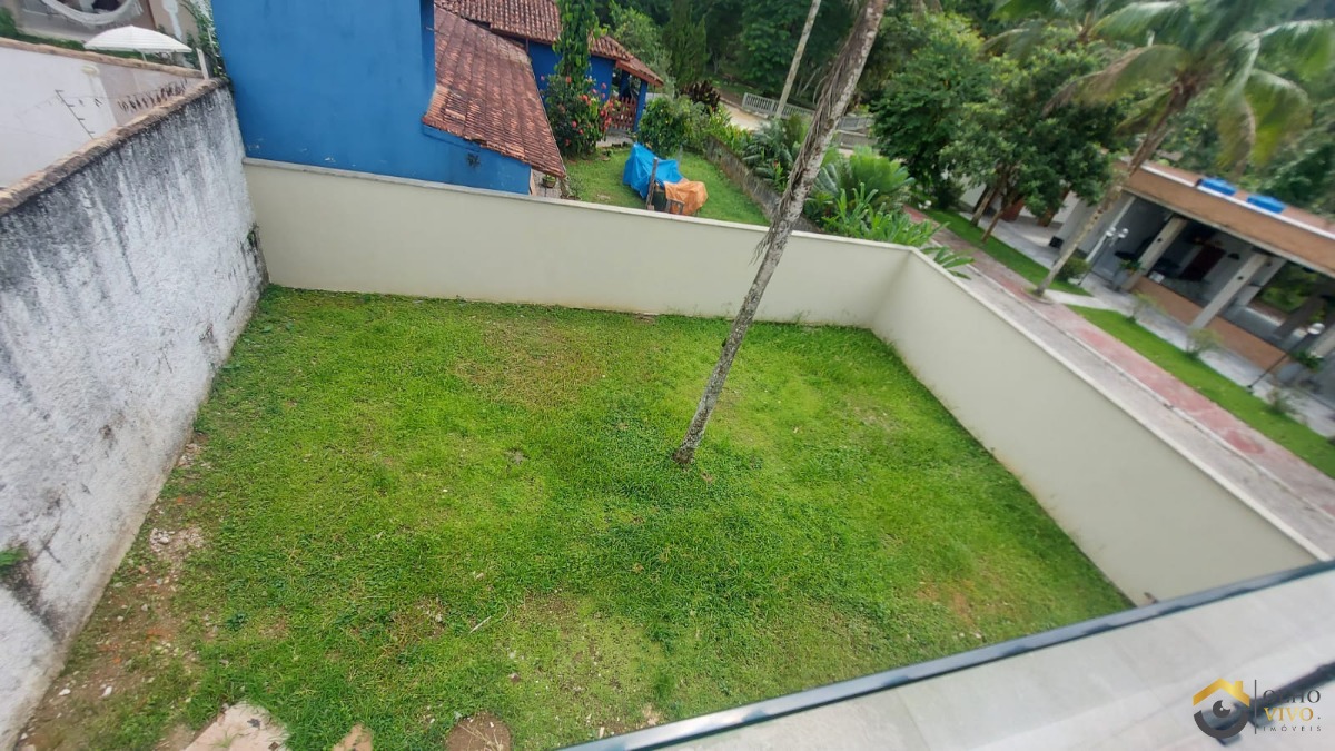 O quintal gramado e o deck de madeira na parte lateral são perfeitos para lazer e atividades ao ar livre. Com três vagas de garagem, esta casa oferece conveniência e praticidade.