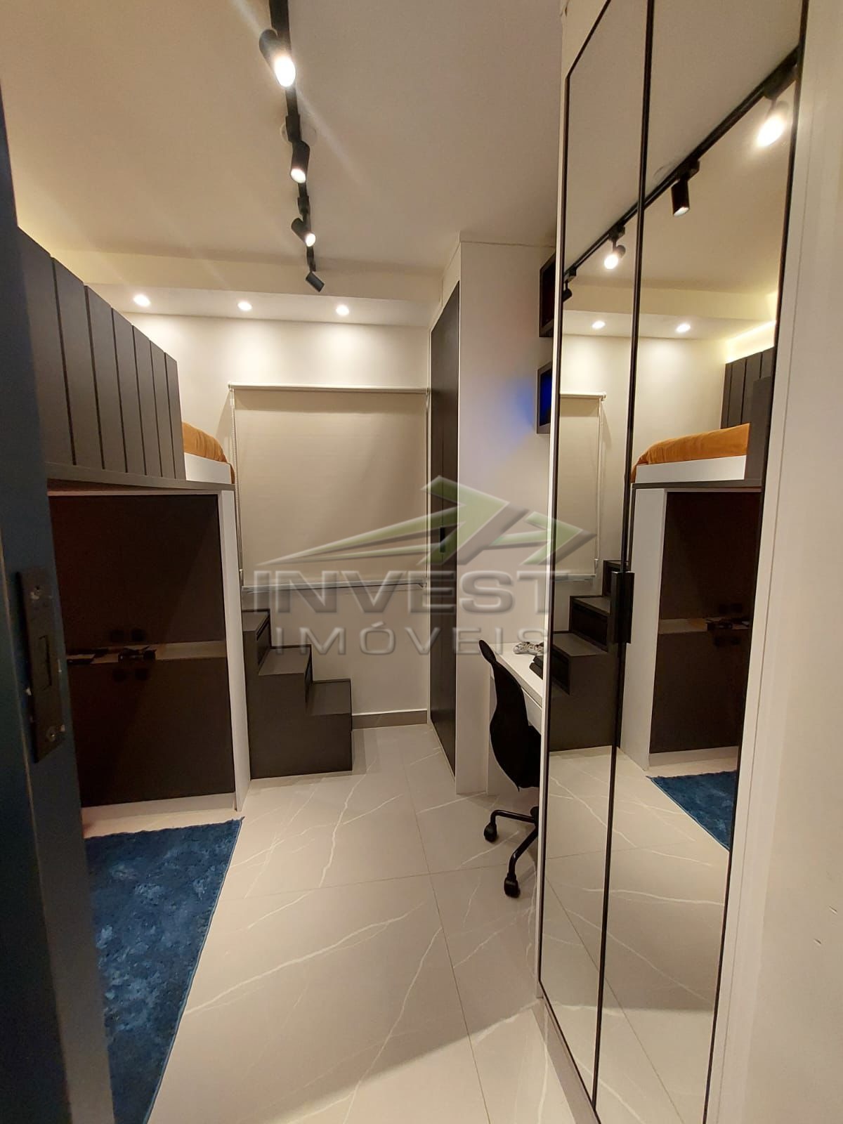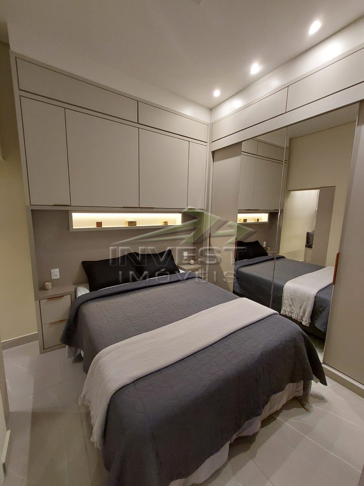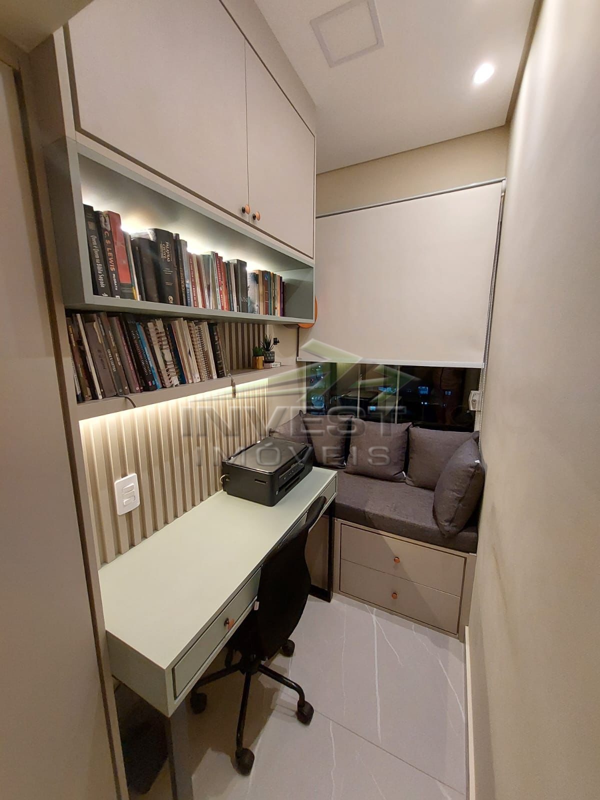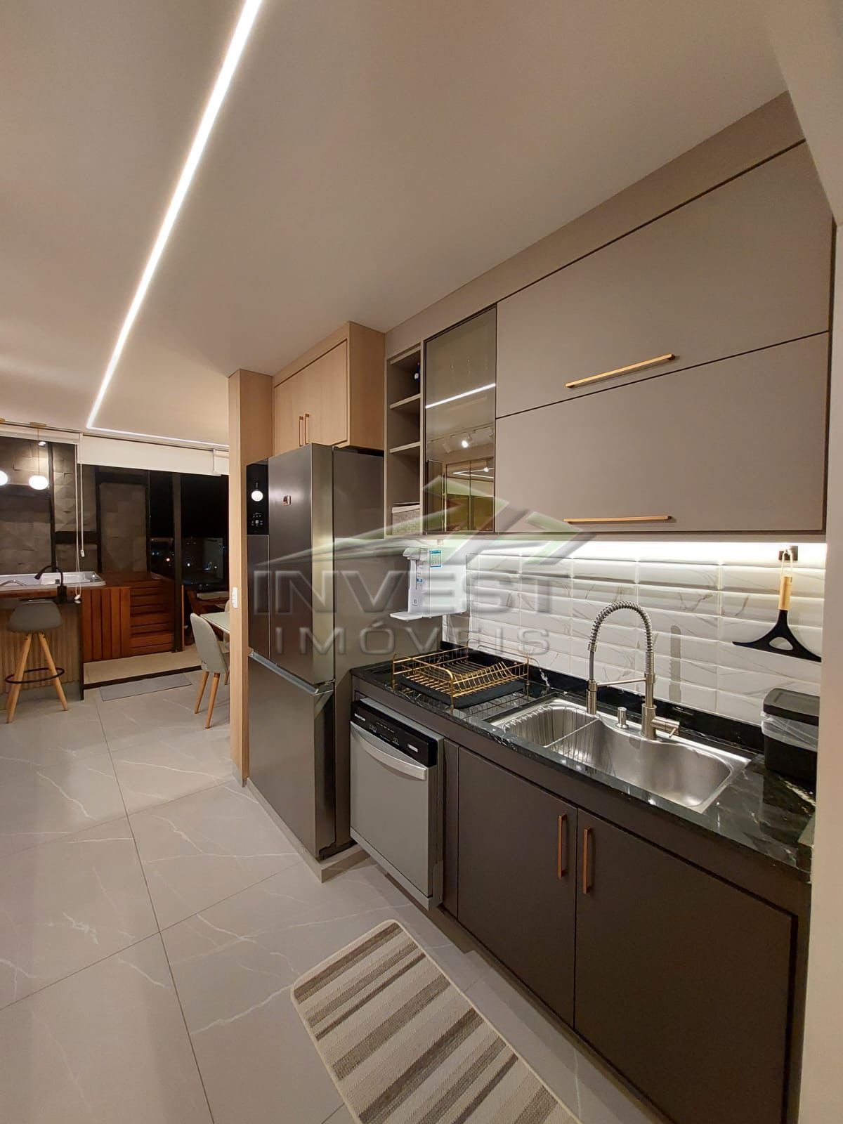 O imóvel é mobiliado e conta com armários de cozinha e embutidos, além de um closet que garante organização.
