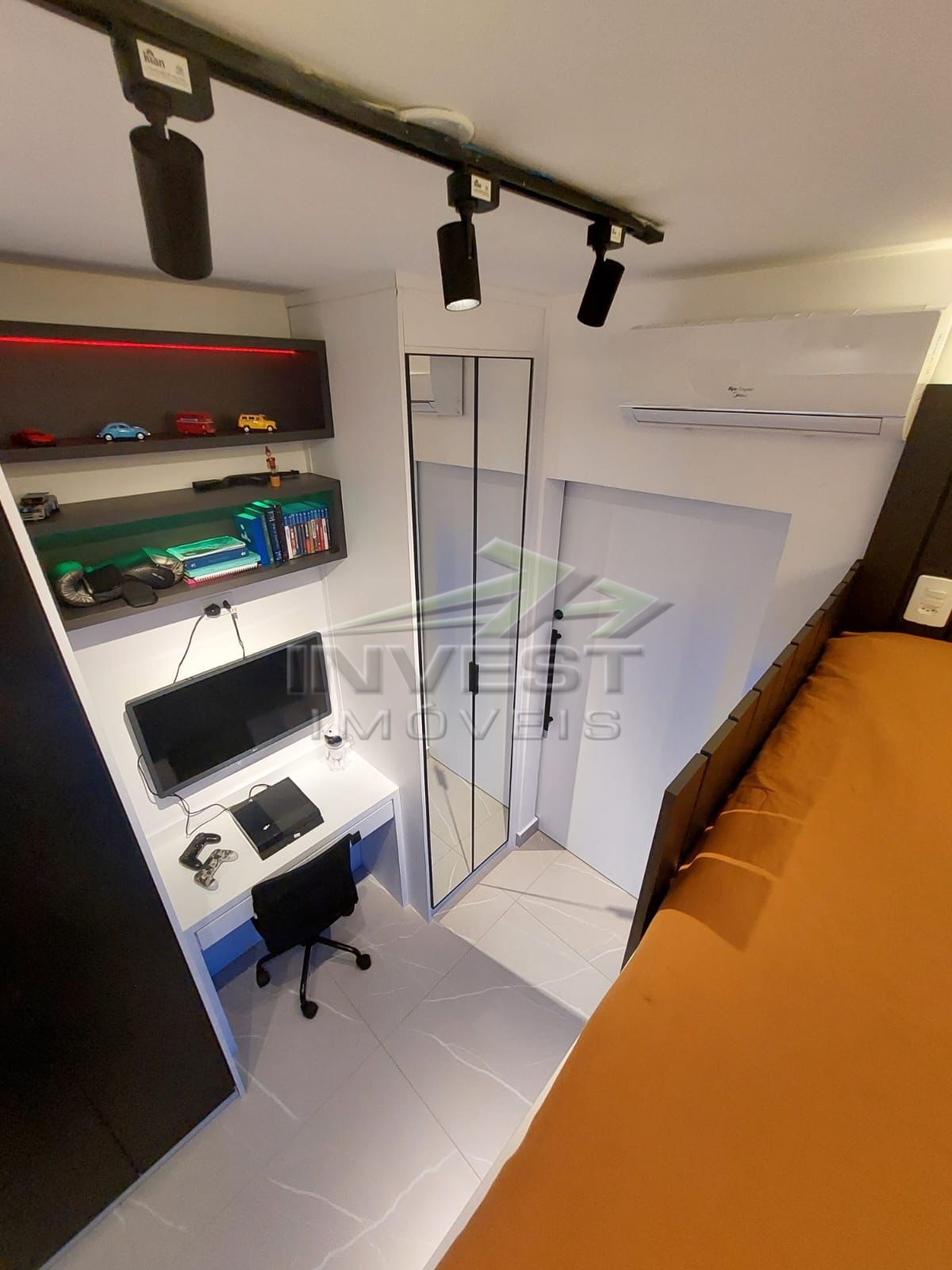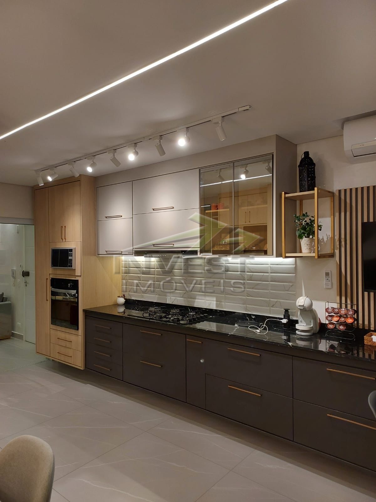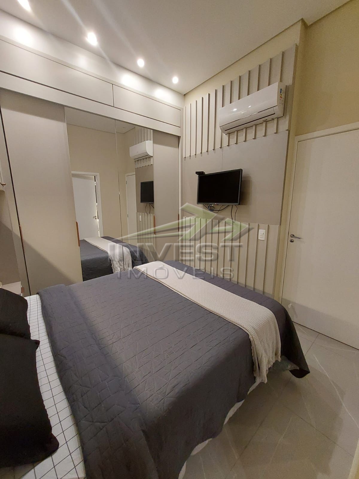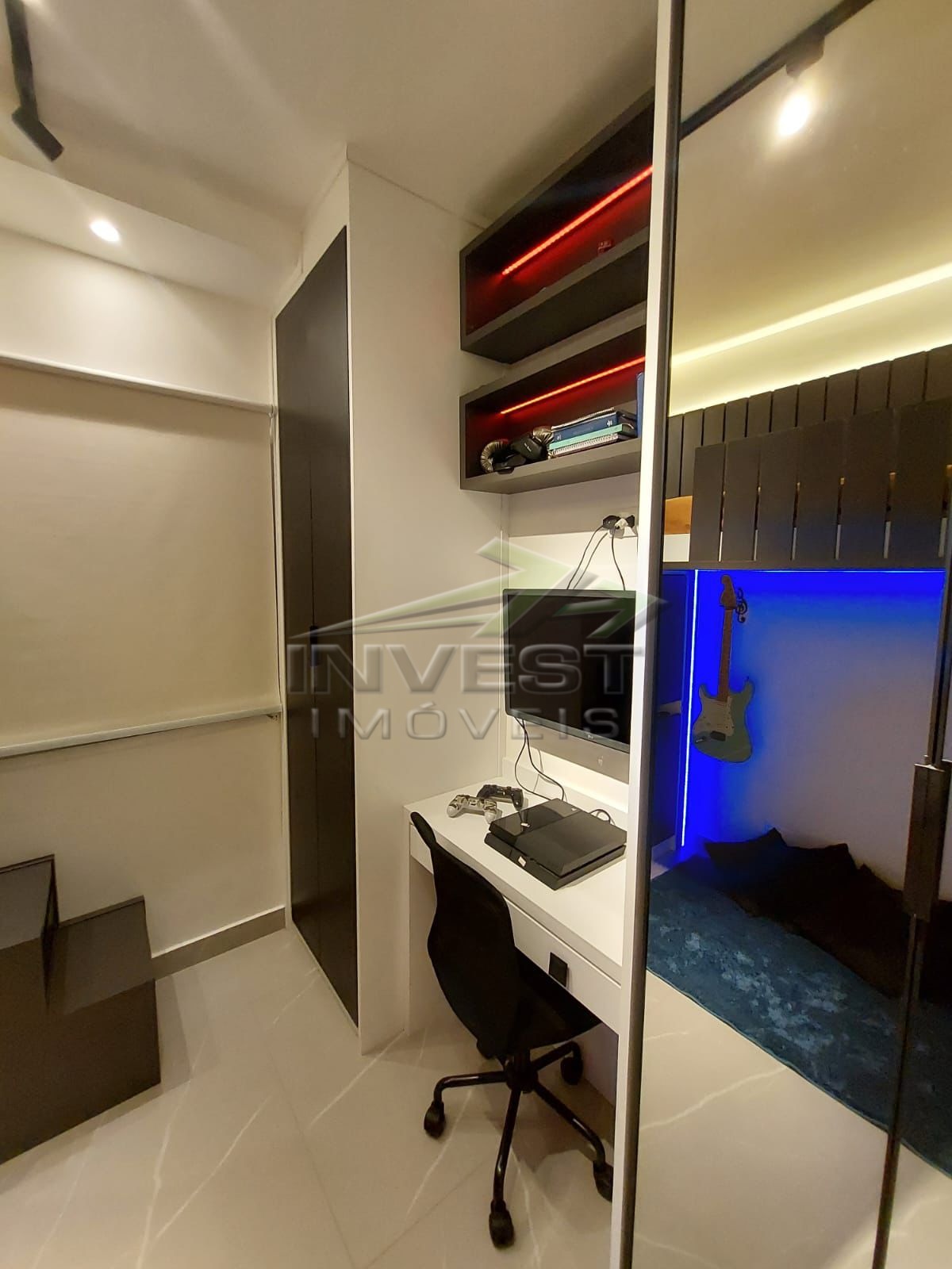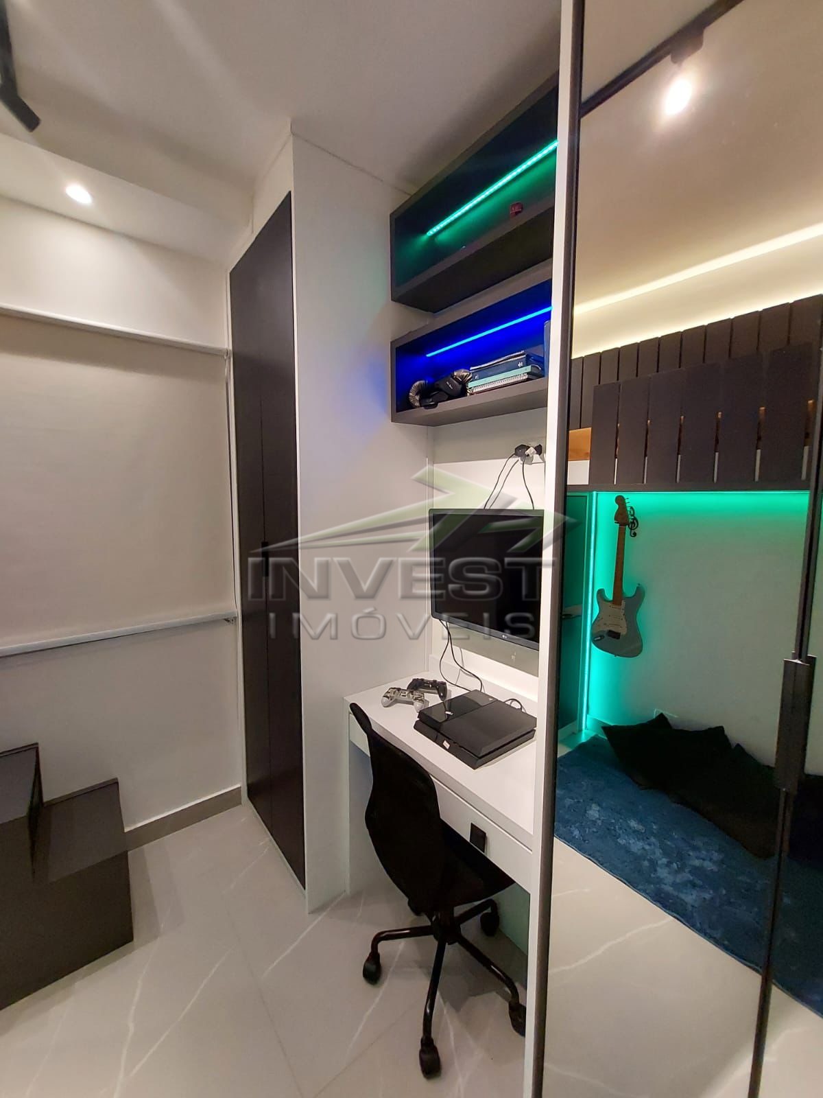 O imóvel é mobiliado e conta com armários de cozinha e embutidos, além de um closet que garante organização.