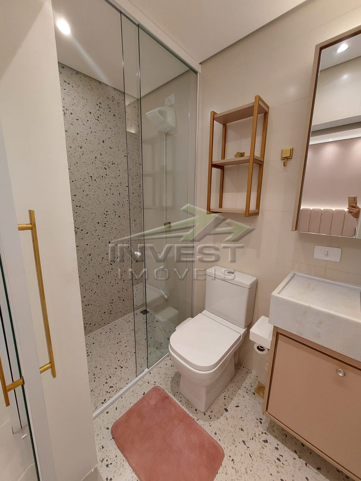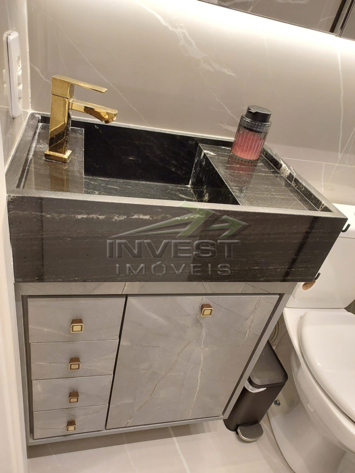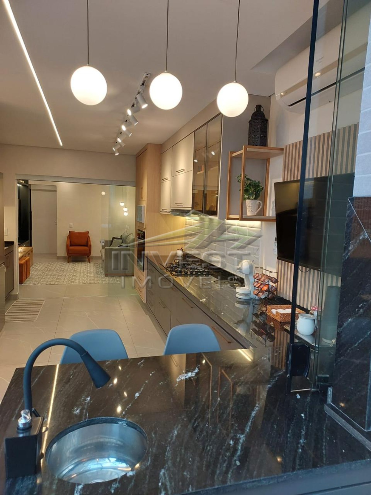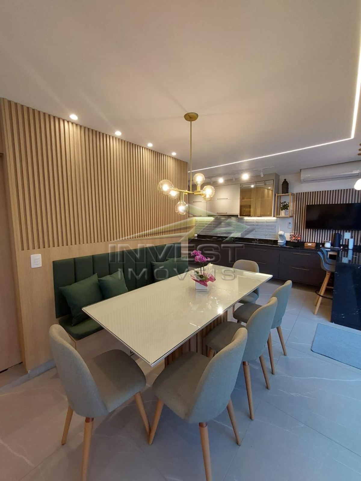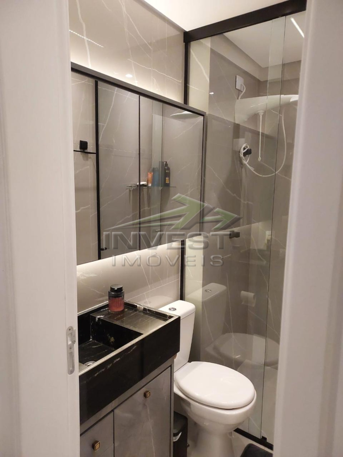 O imóvel é mobiliado e conta com armários de cozinha e embutidos, além de um closet que garante organização.