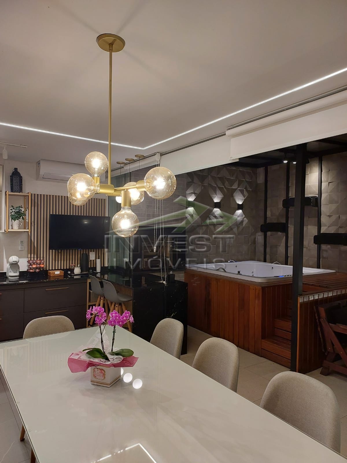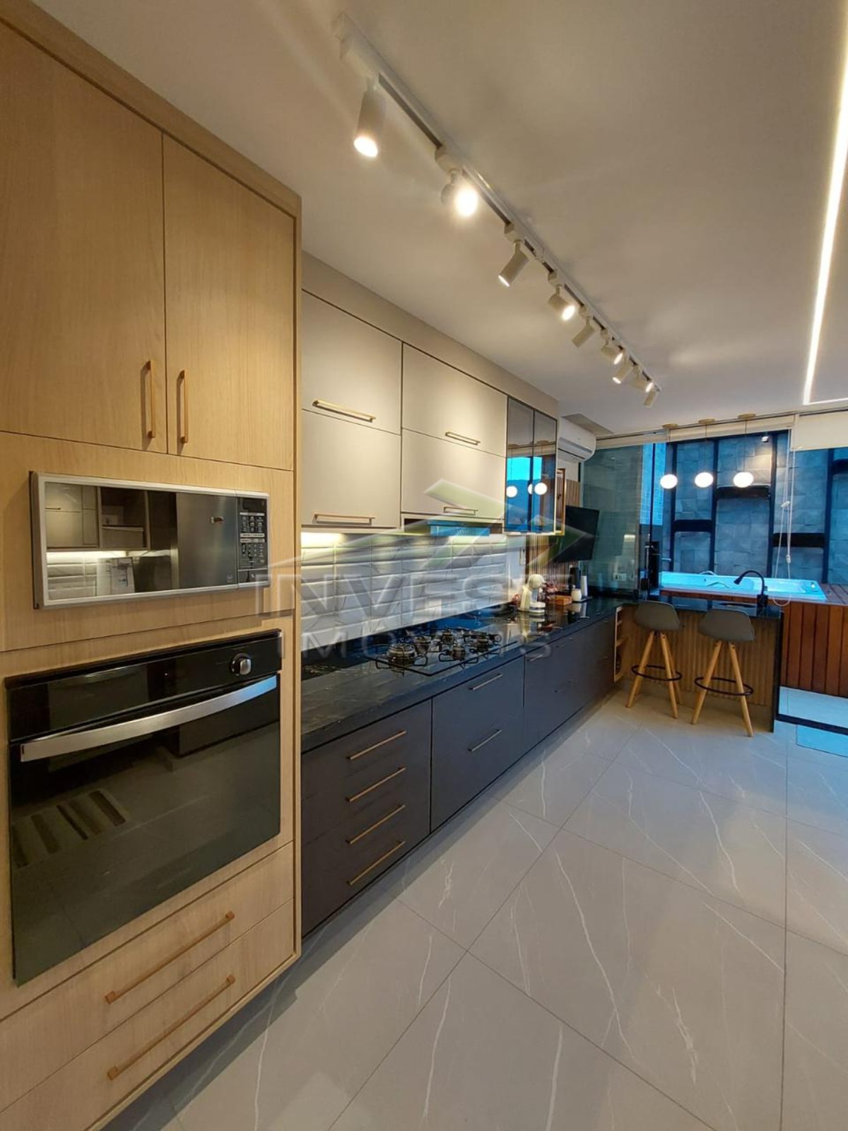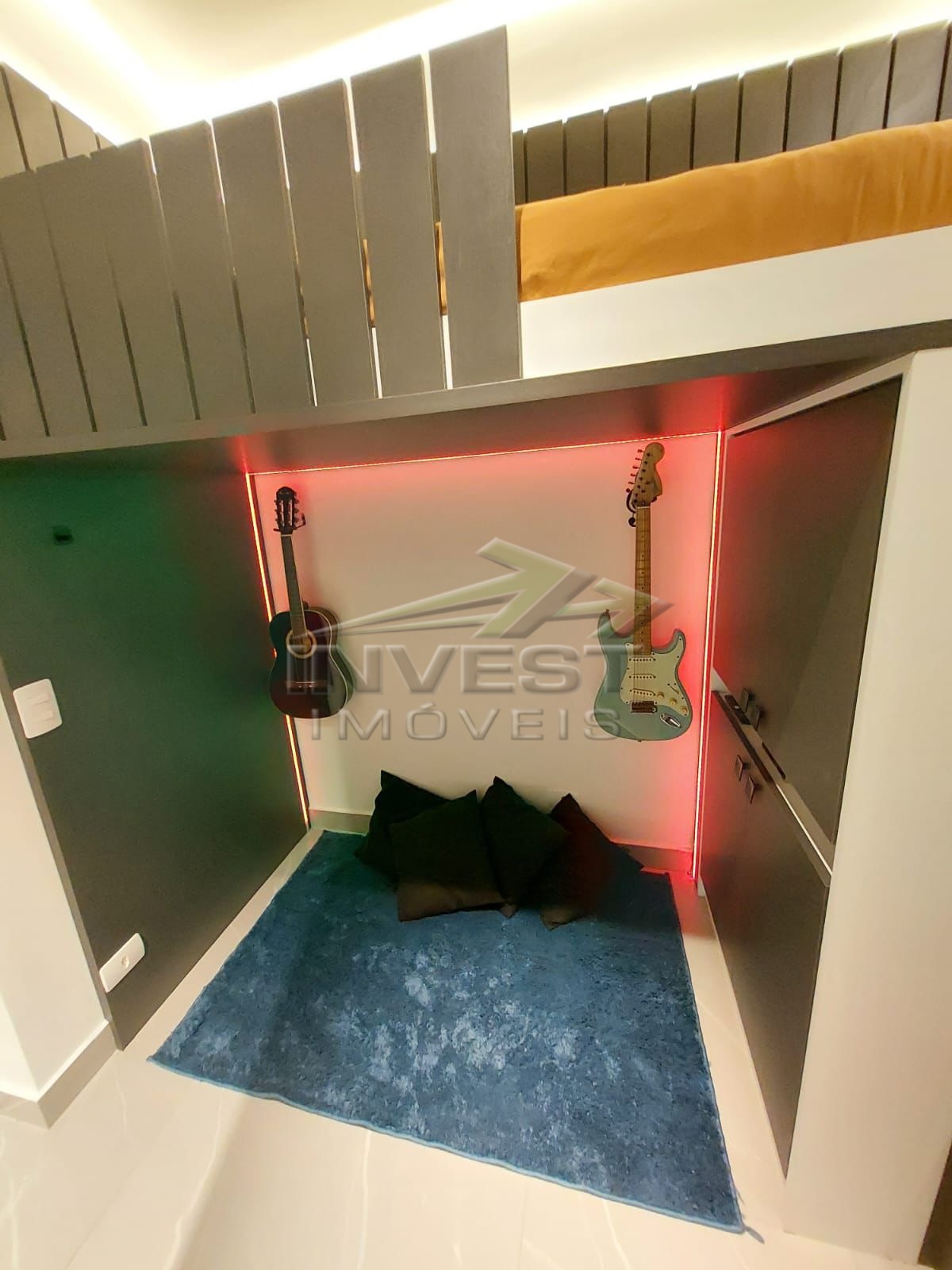 O apartamento ainda possui um mezanino, escritório, lavabo e área de serviço, além de ar condicionado e ventiladores para maior conforto.