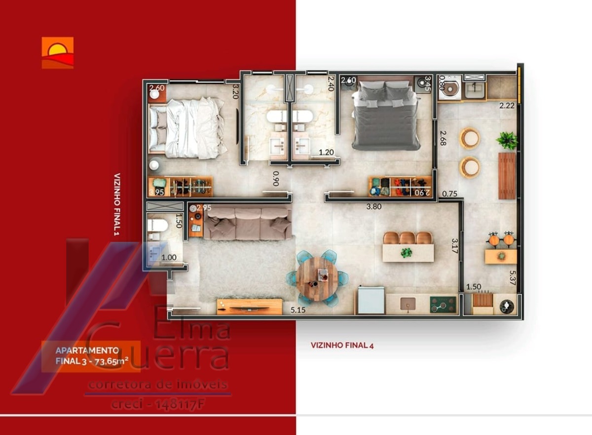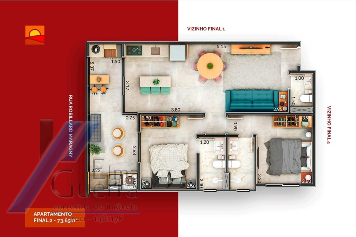 Imóvel com 02 dormitórios, sendo 01 suíte, 01 banheiro social, sala, copa, cozinha, varanda gourmet com churrasqueira, área de serviço, armário náutico e 01 vaga de garagem coberta.