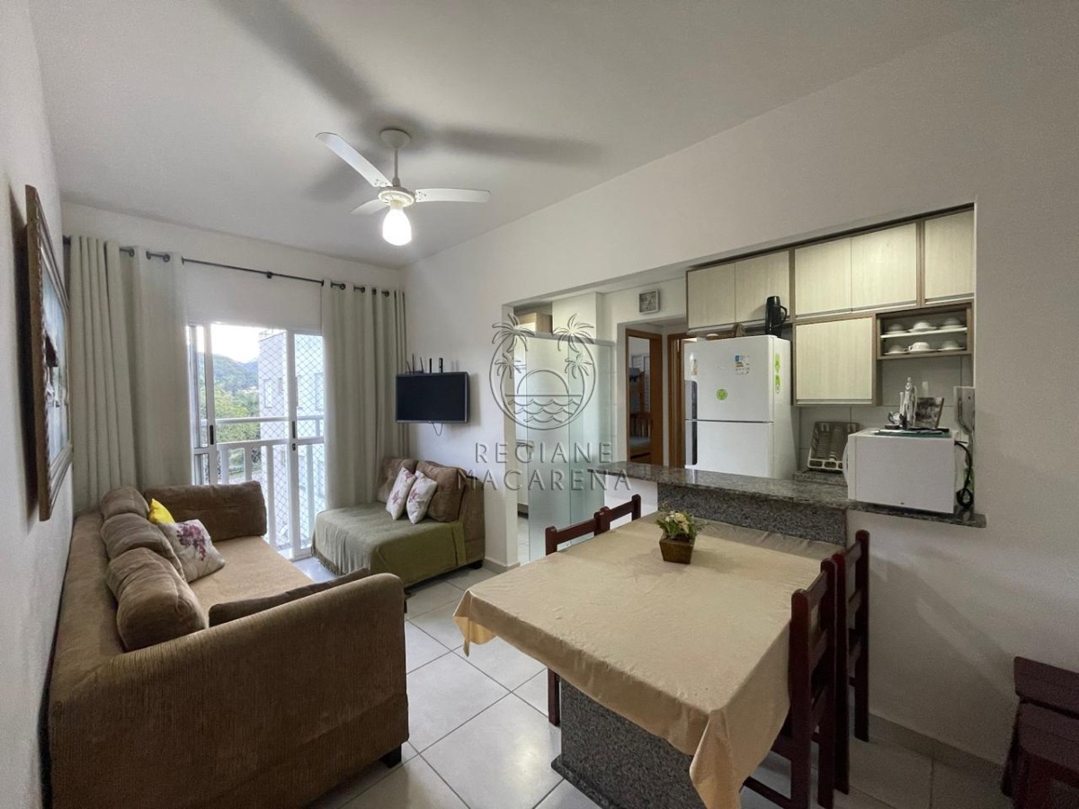 Apartamento localizado na praia, com elevador para maior comodidade, possui 2 dormitórios, 1 banheiro, sala de estar e jantar espaçosa e bem iluminada, cozinha com armários planejados, lavanderia e uma vista deslumbrante para a montanha.