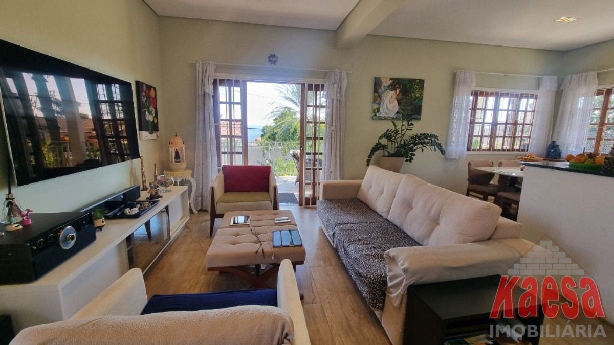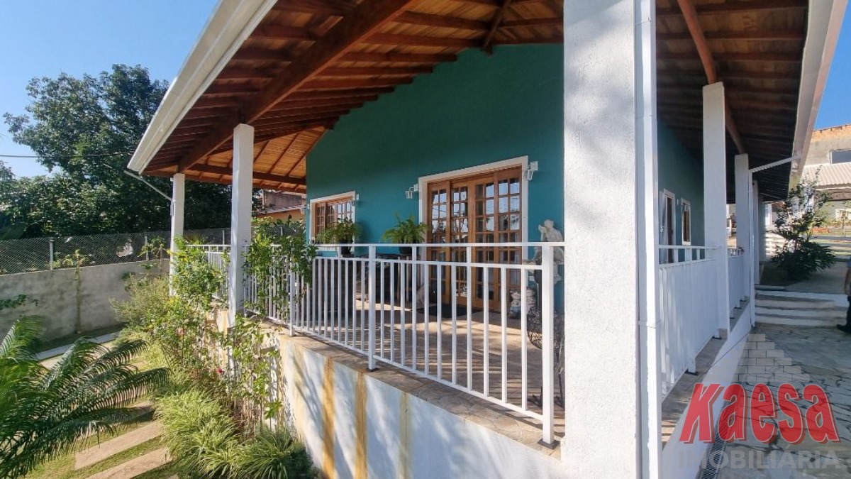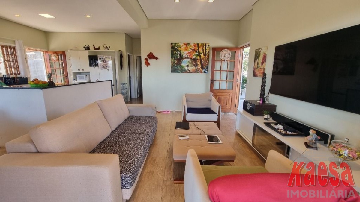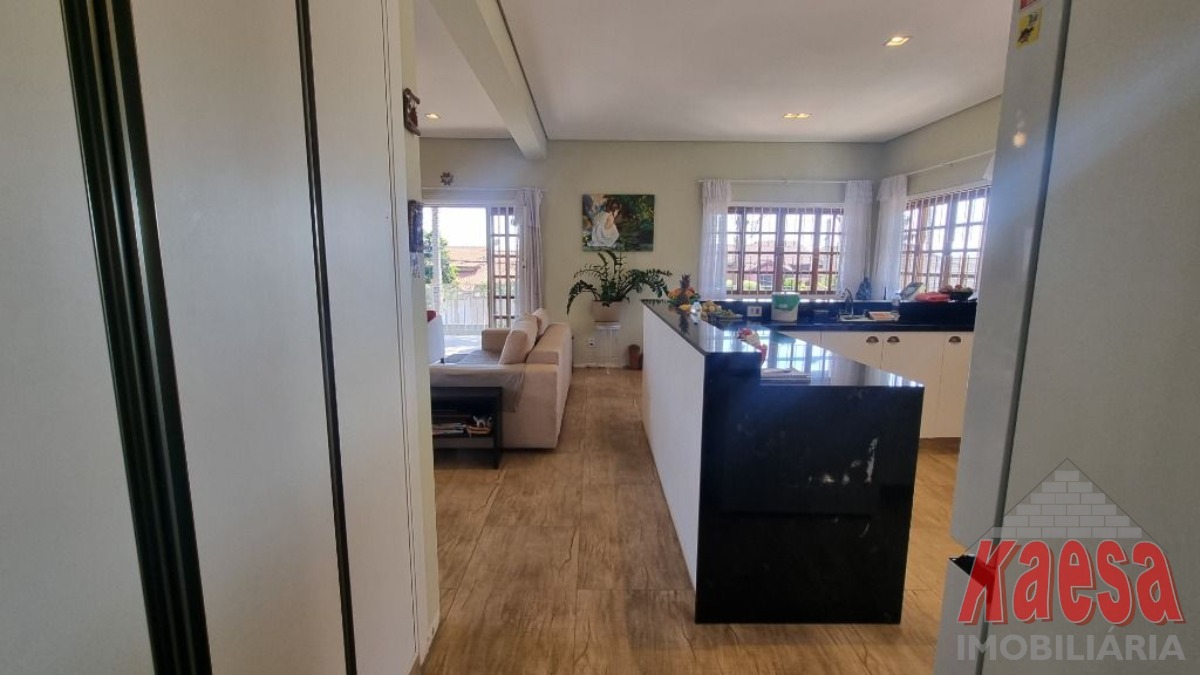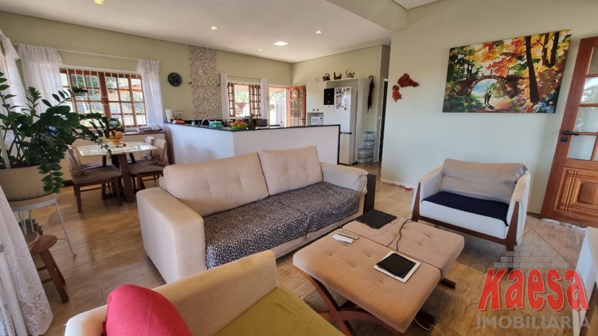 Esta linda casa térrea completamente avarandada possui uma ampla sala de estar integrada à cozinha, que recebe generosa luz natural.
