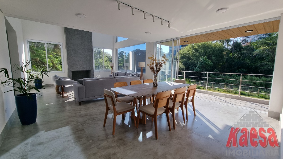 O imóvel possui 5 suites, sendo 2 master, sala 2 ambientes com pé direito duplo, cozinha americana, lareira, varanda, despensa, 2 lavabos, elevador...