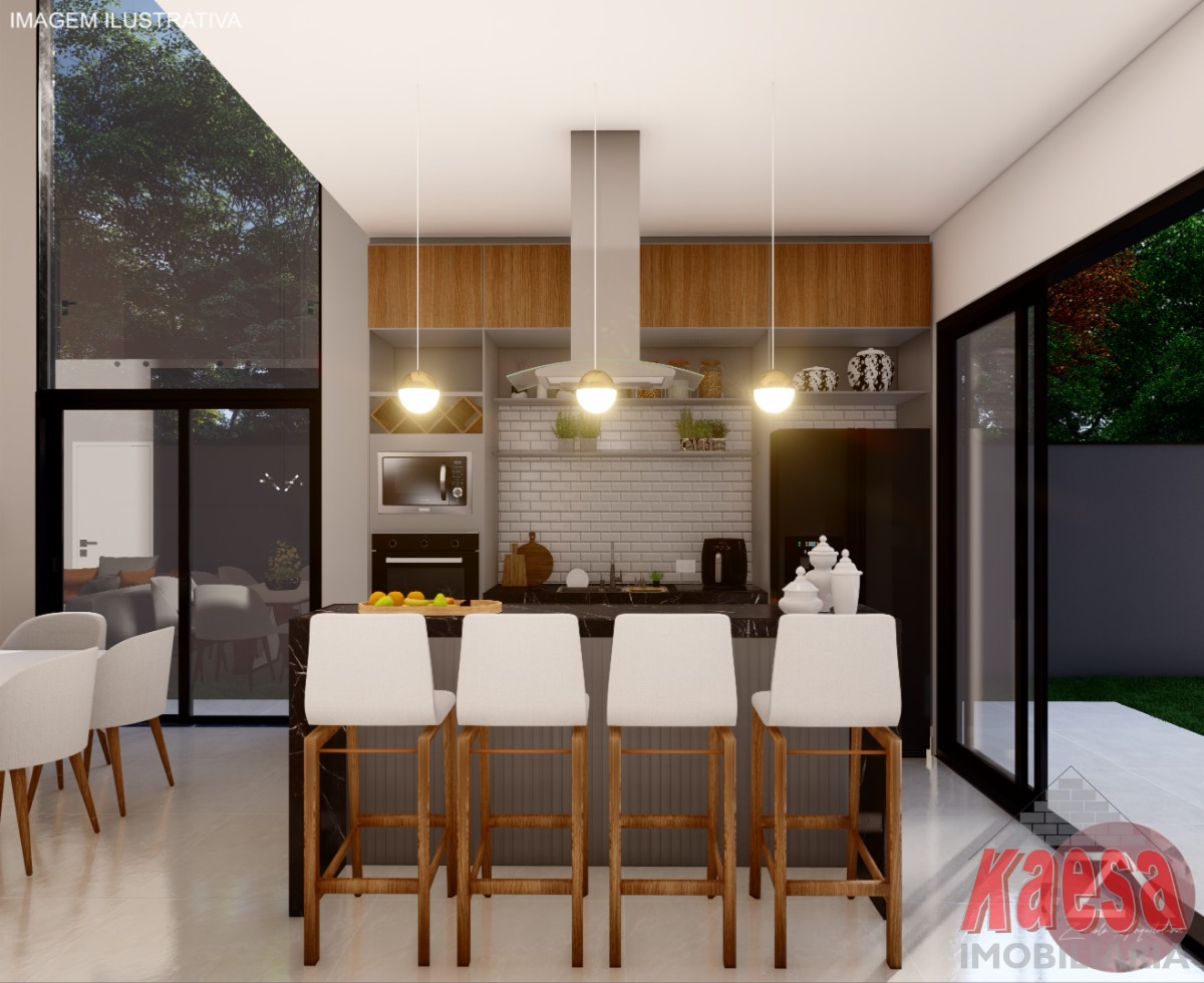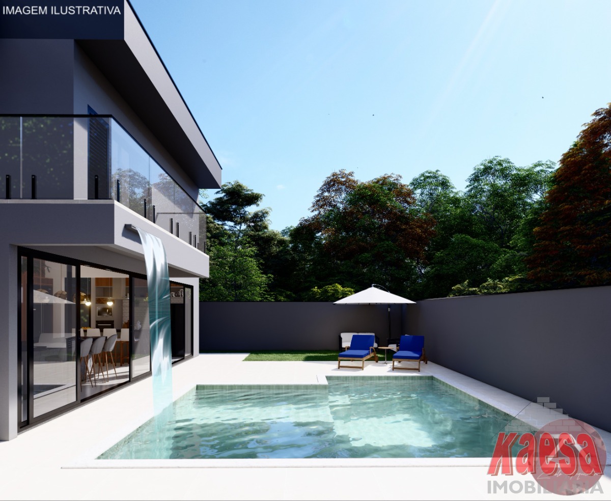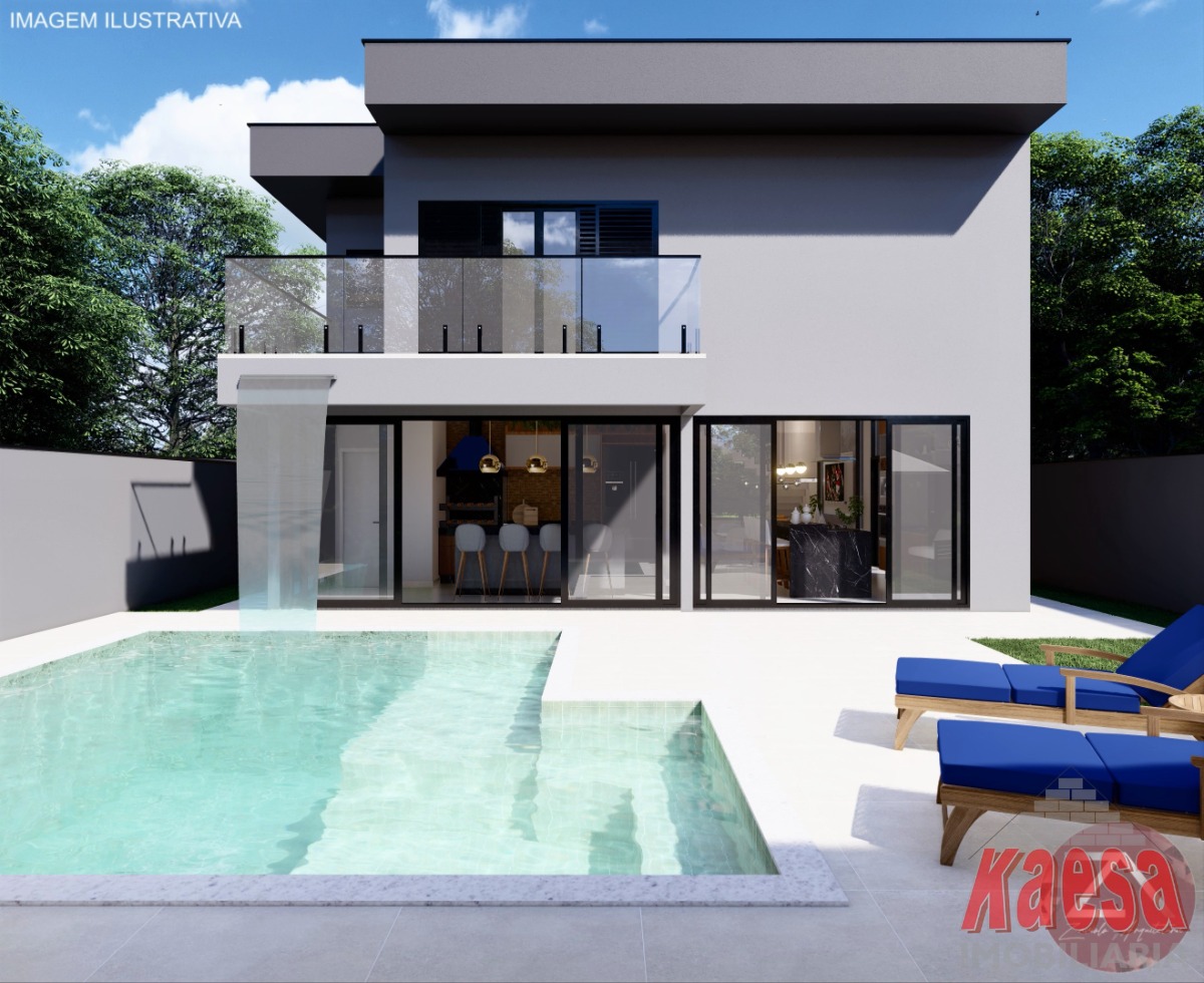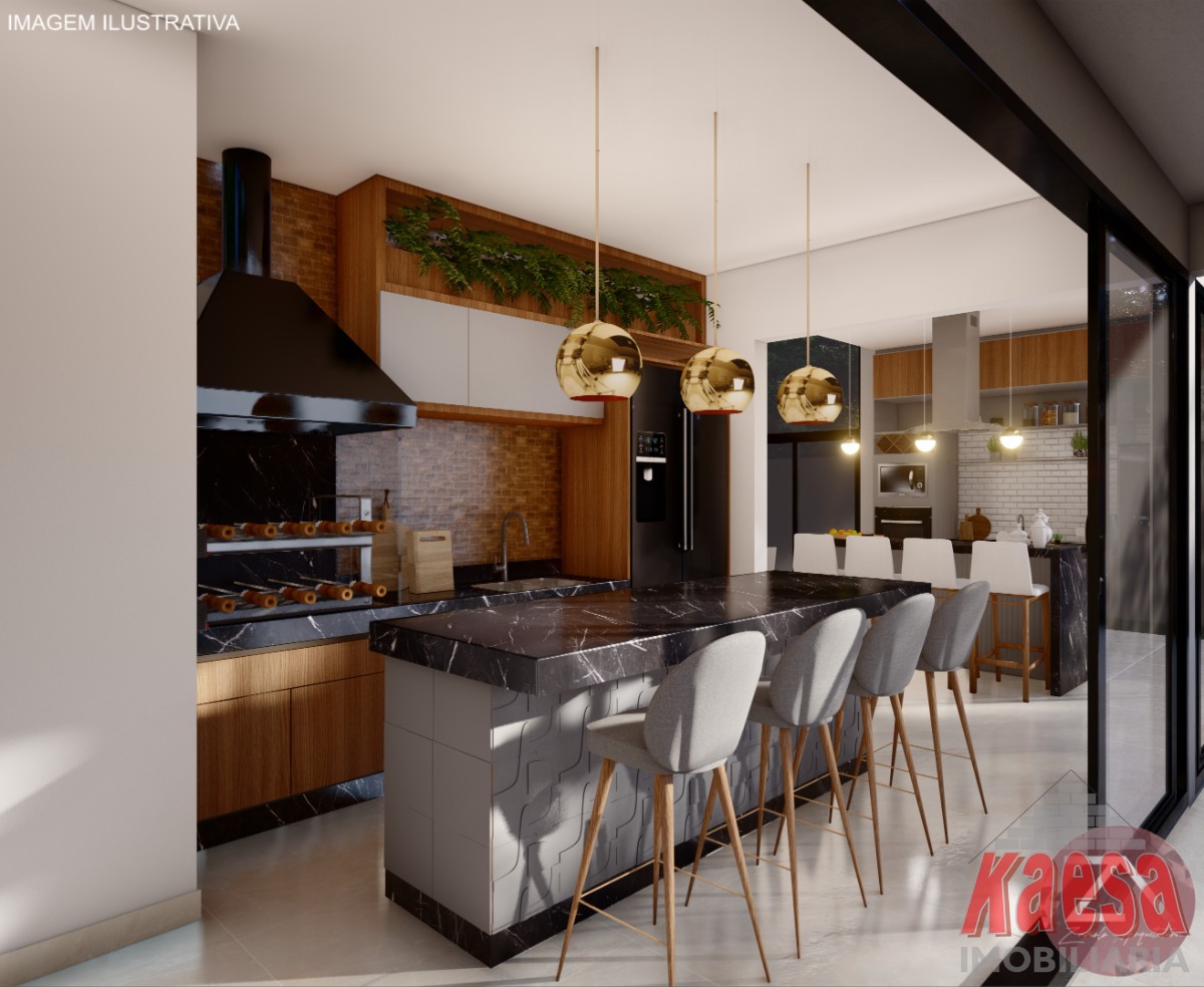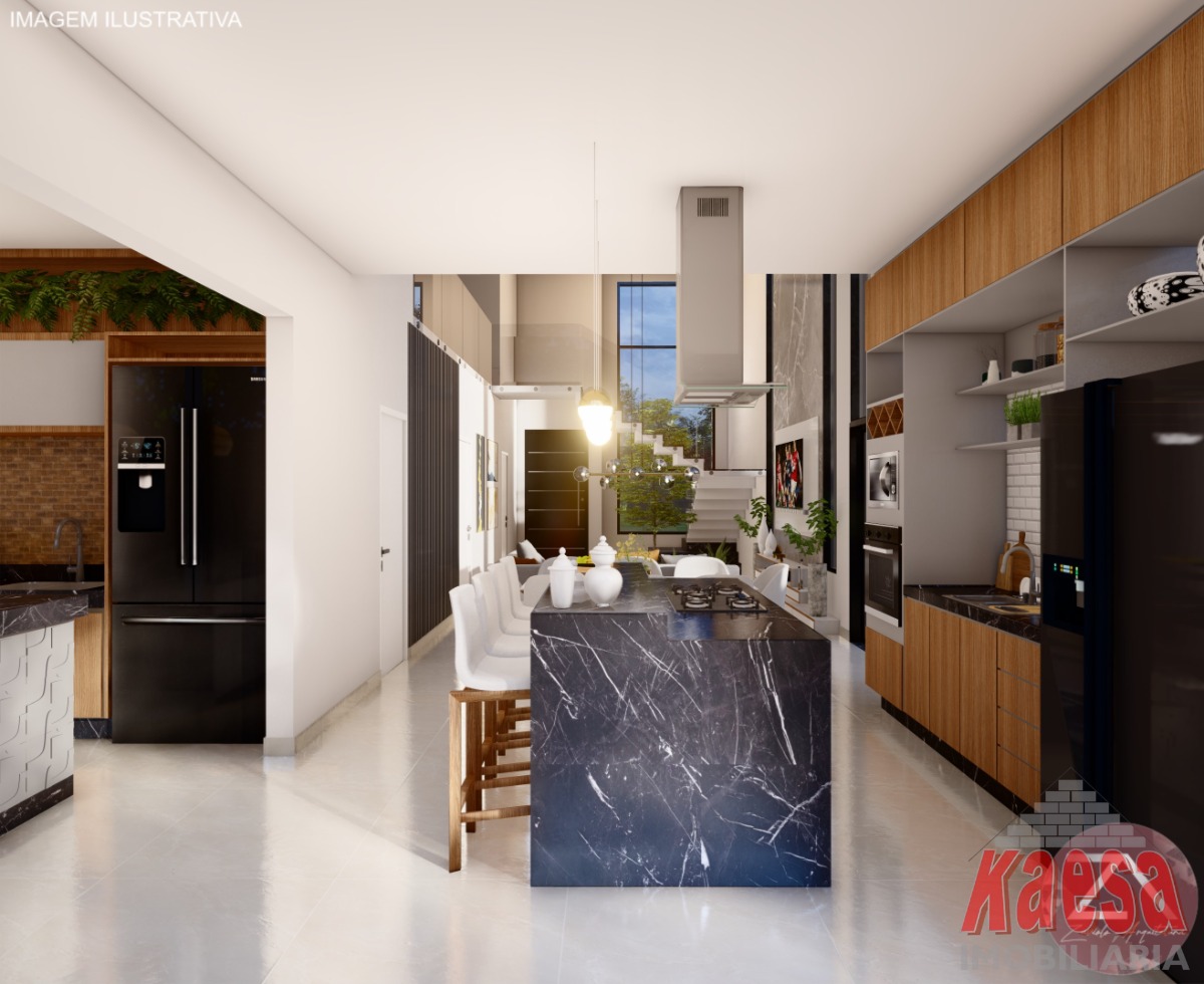 com pé direito duplo e em conceito aberto integrando a Cozinha com a área Gourmet, Lavabos, Piscina aquecida com cascata,
