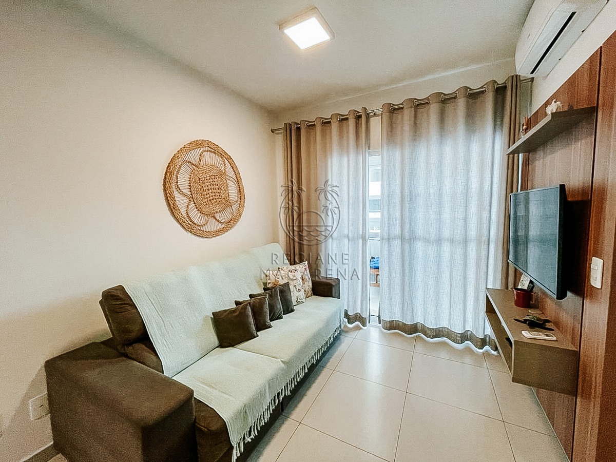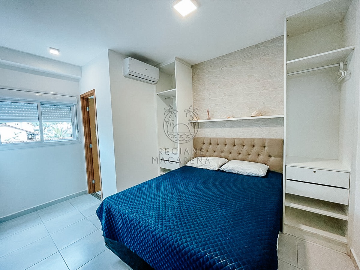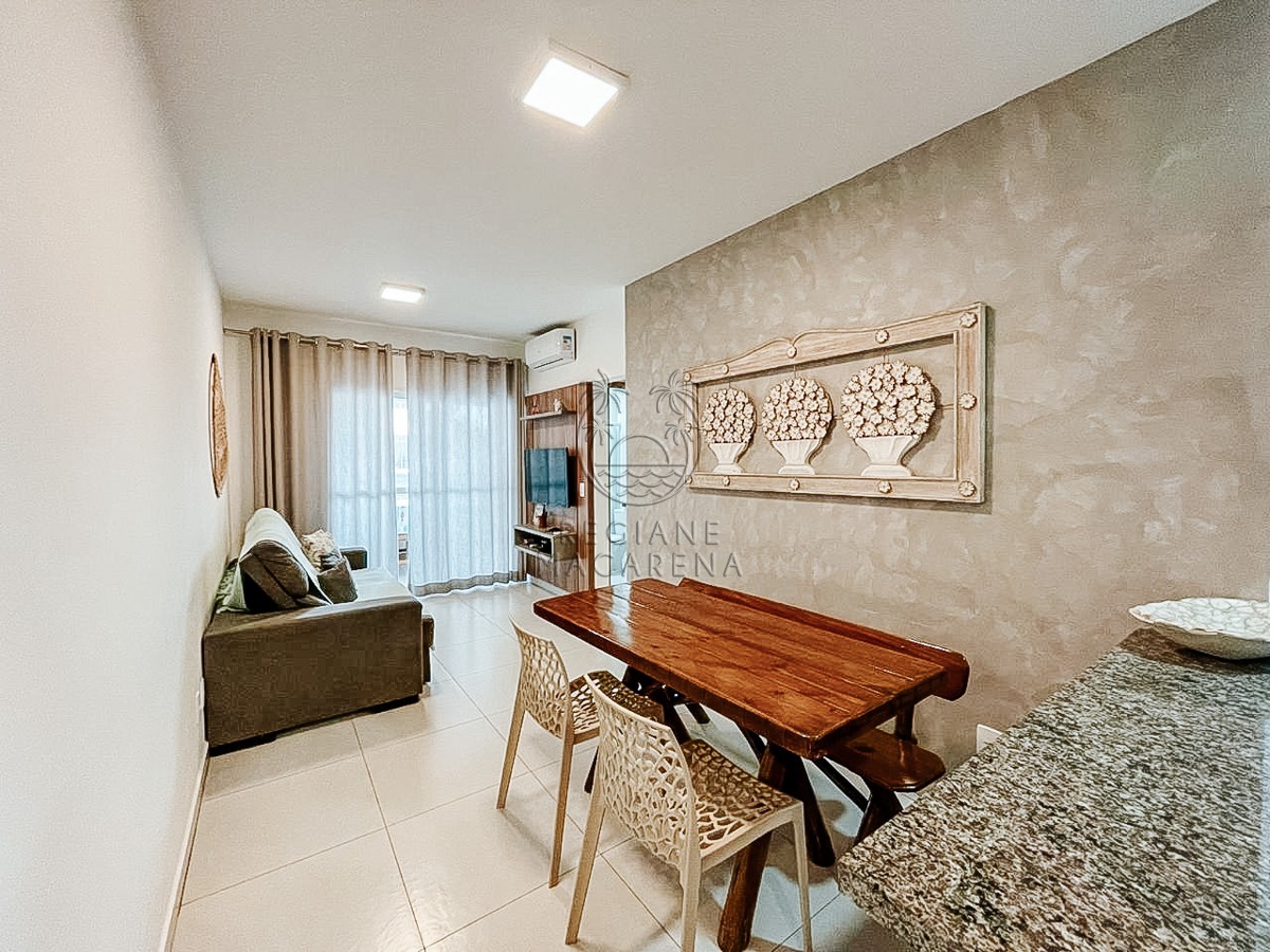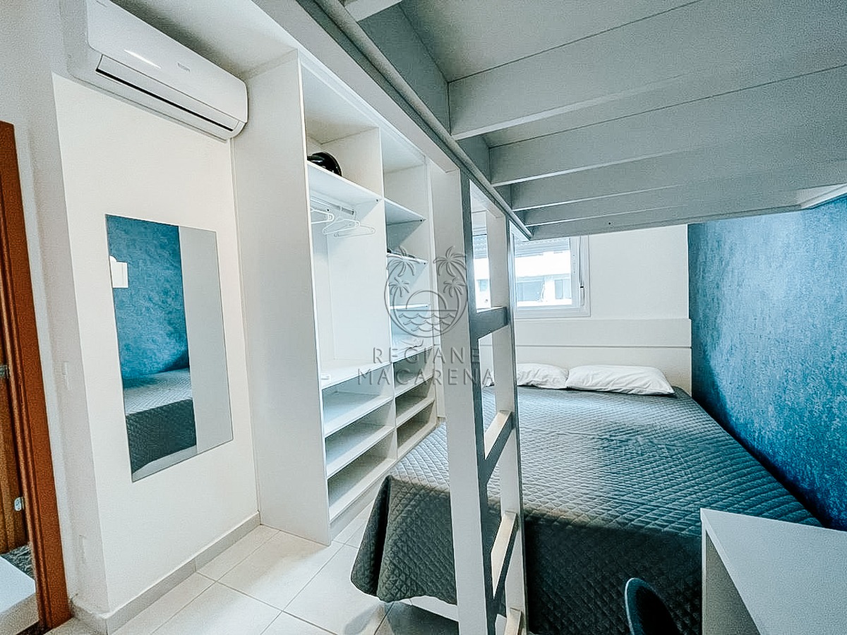 O apartamento possui móveis planejados de alta qualidade e ar condicionado, garantindo conforto térmico em todas as estações. A unidade entrega uma atmosfera leve e luminosa, ideal para quem busca um refúgio à beira-mar.
