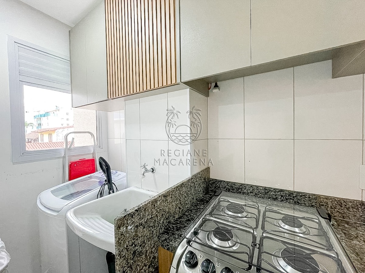 A cozinha, equipada com bancada, é prática e funcional. A área de serviço adjacente acrescenta a conveniência necessária para o dia a dia.