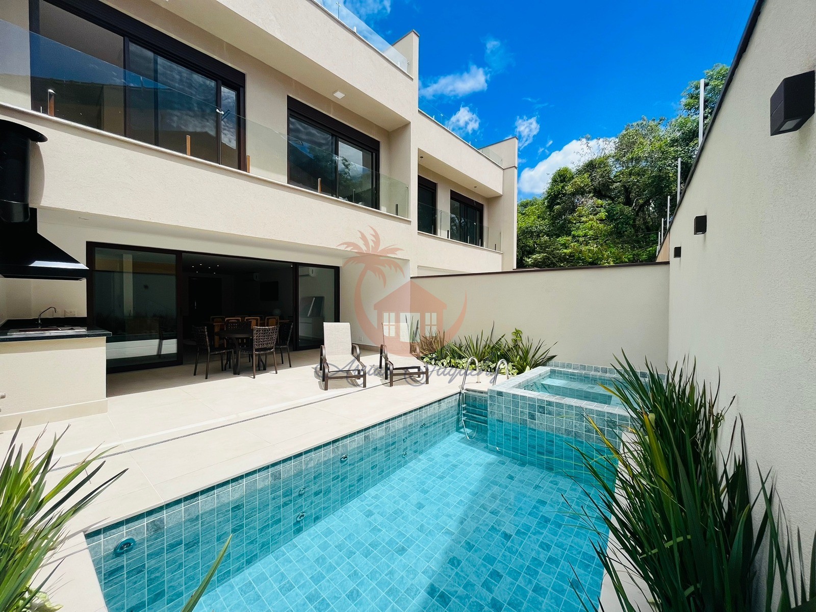 O imóvel possuí 4 suítes, sala de estar, sala de jantar integrada a cozinha americana, piscina privativa com hidromassagem, área de churrasqueira e 2 vagas na garagem.