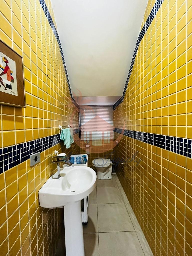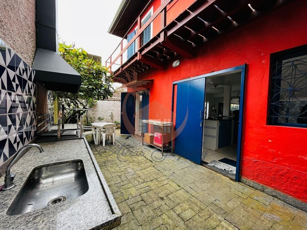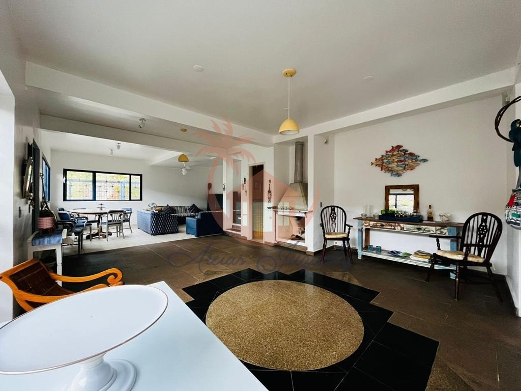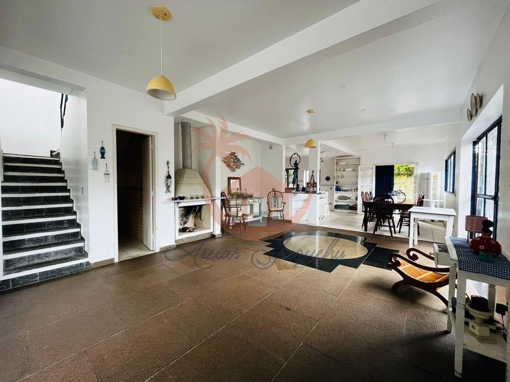 Sobrado com 5 quartos sendo uma suíte, sala ampla com 3 ambientes, lareira, lavabo, cozinha americana, garagem, churrasqueira e terraço com uma vista para o mar.