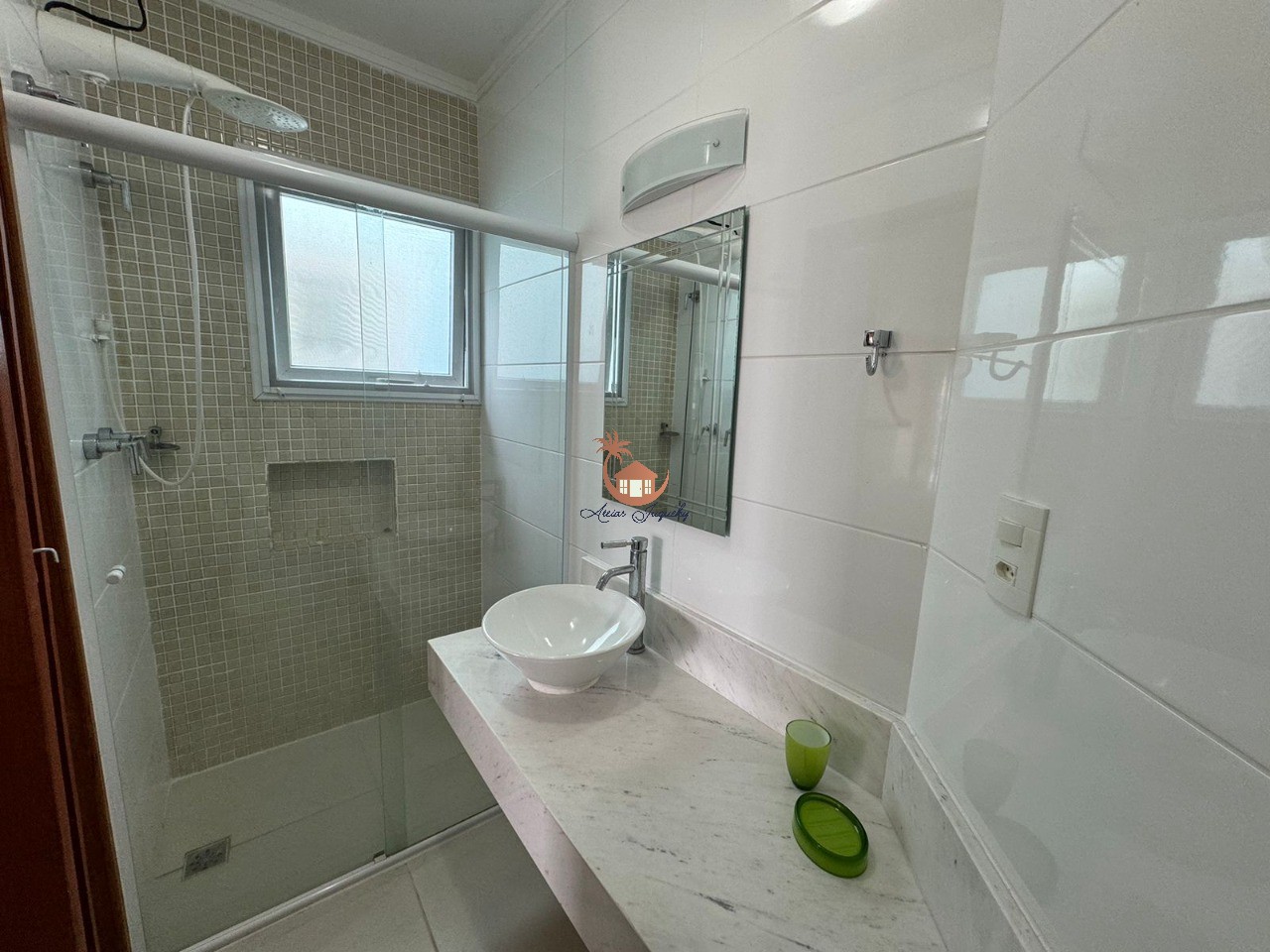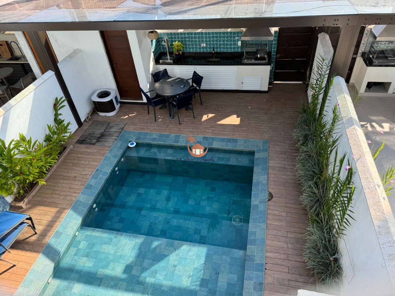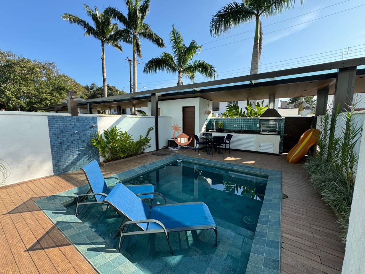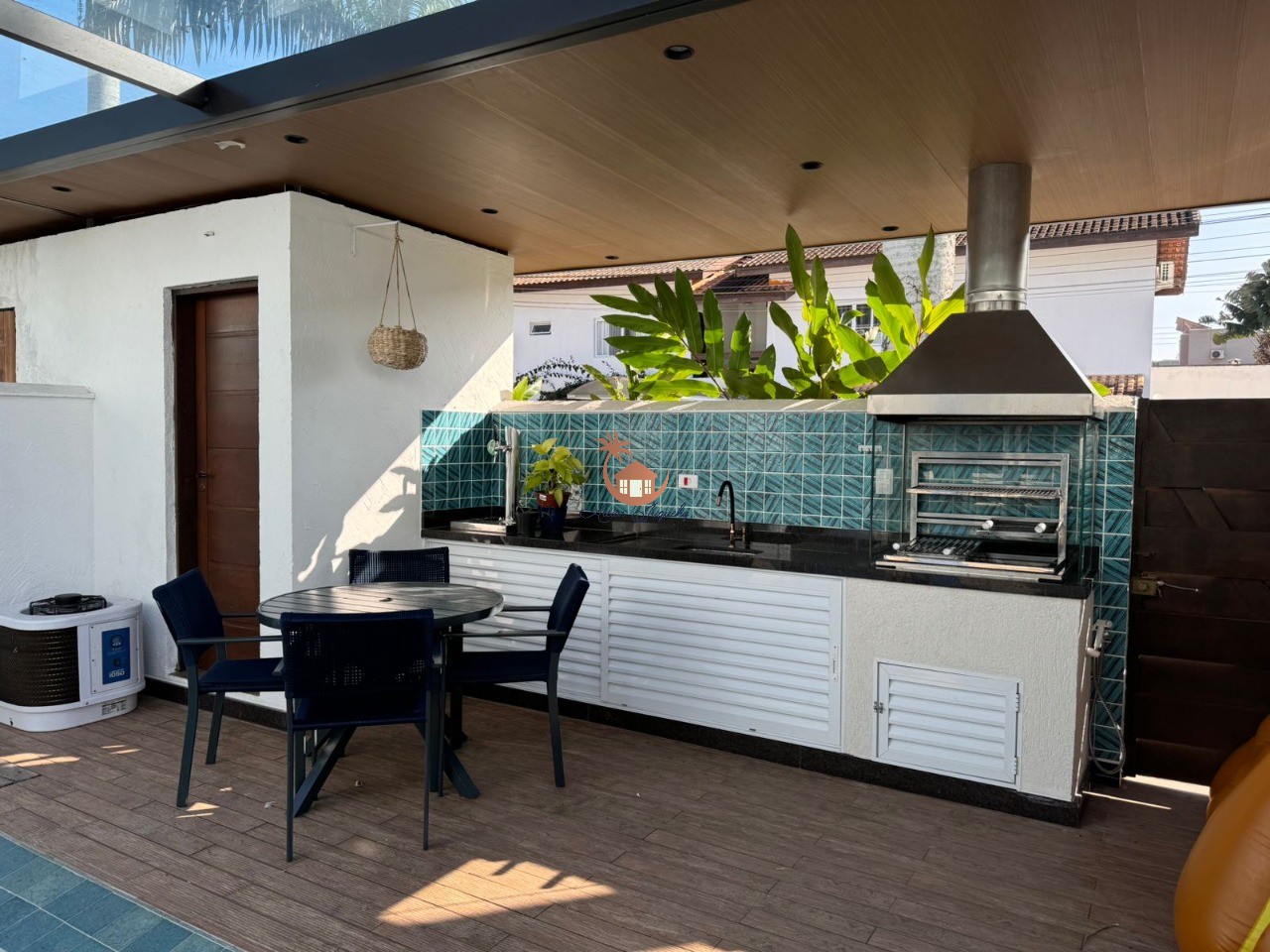 O sobrado conta com 5 suítes, lavabo, sala de estar e jantar, cozinha americana, piscina e churrasqueira privativas.