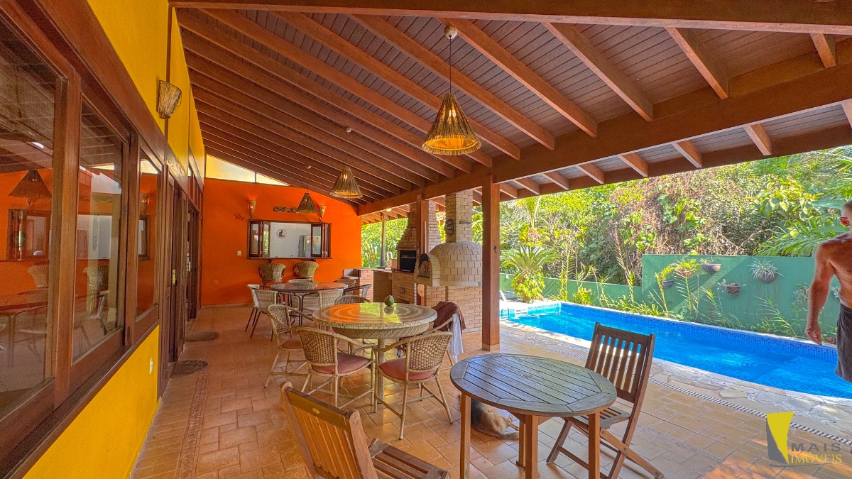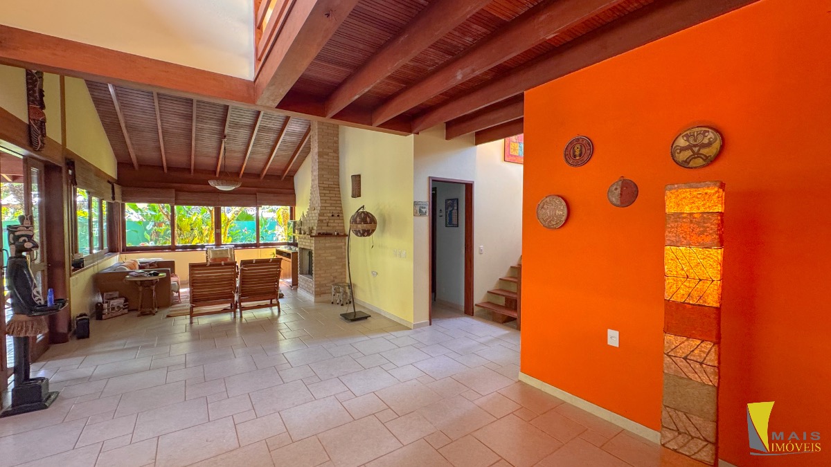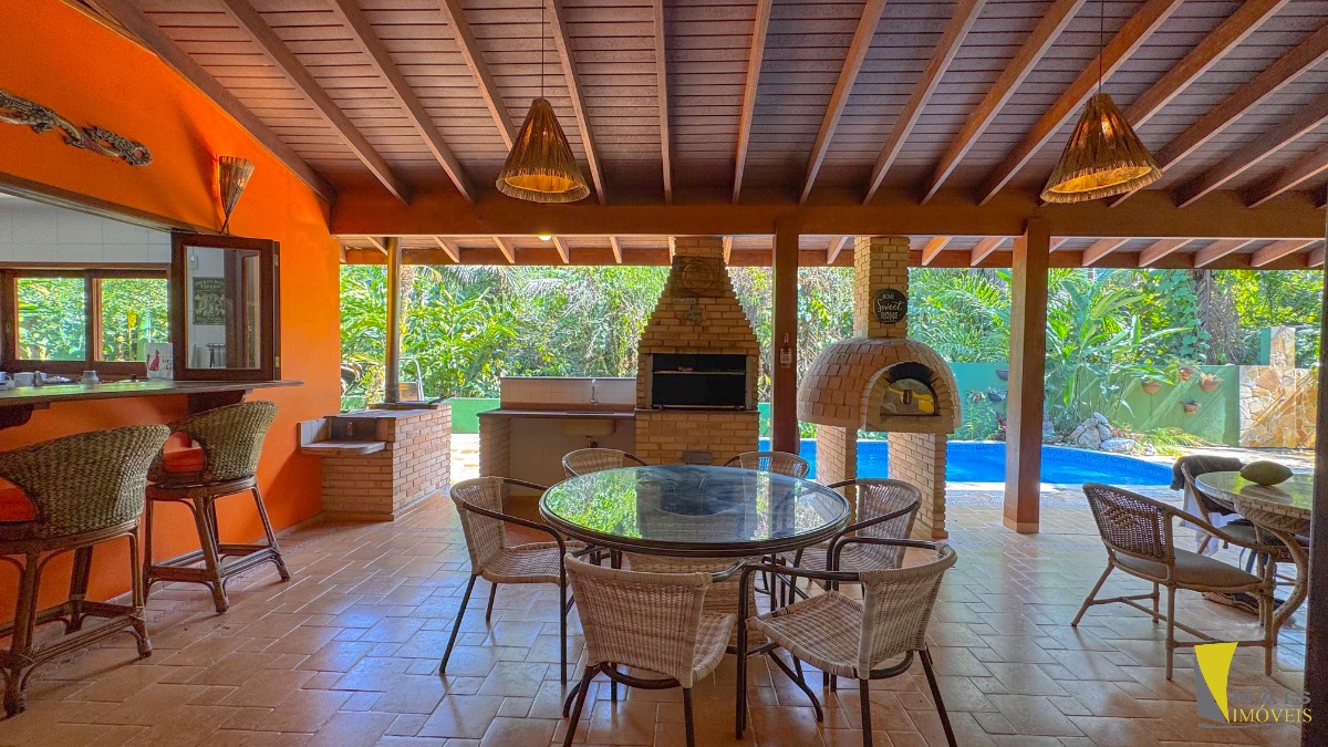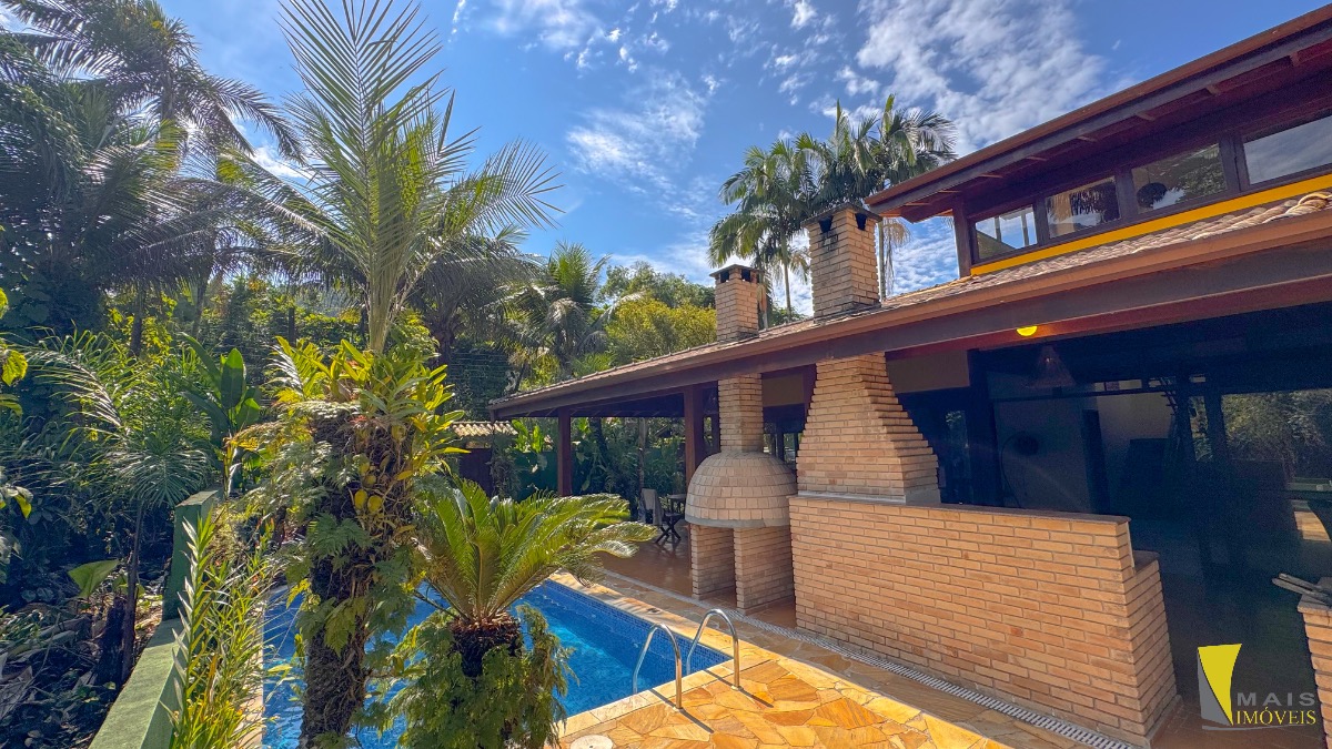 São 3 dormitórios, sendo 3 suítes(sendo 1suíte master com spa piso de cima), 1 banheiro, cozinha, sala de Tv, sala de jantar com lareira , área gourmet com churrasqueira e forno a lenha, piscina.