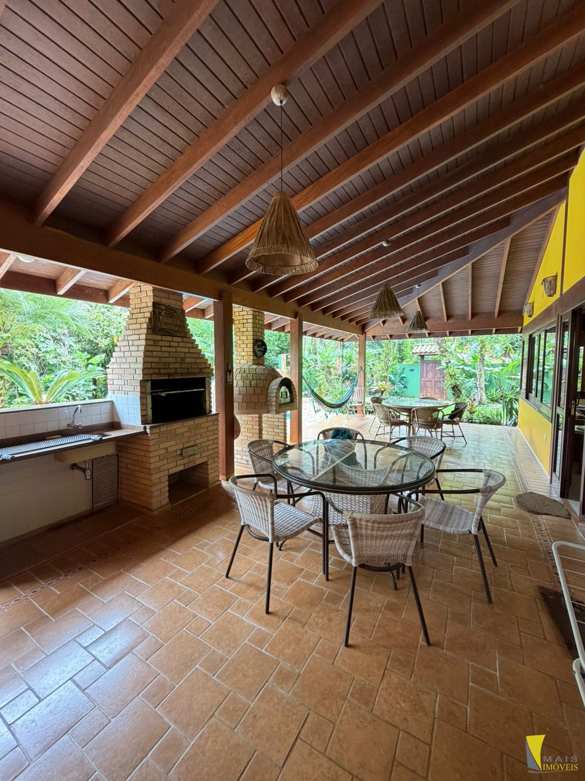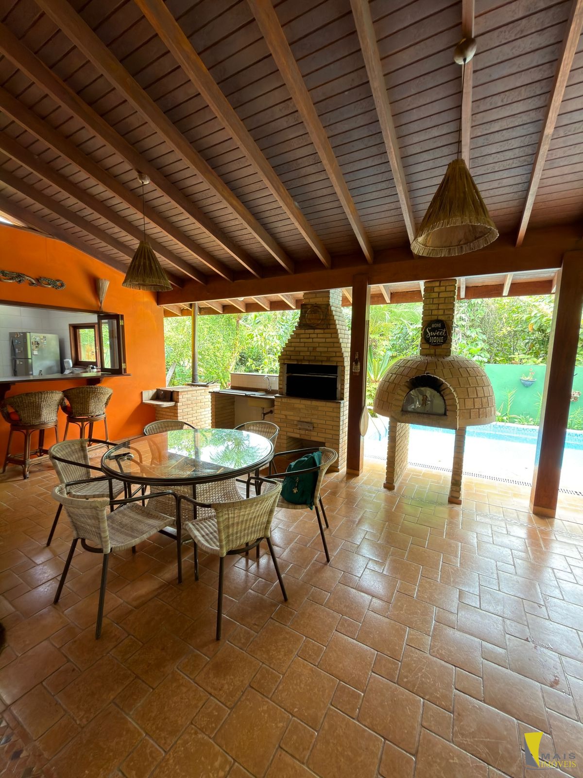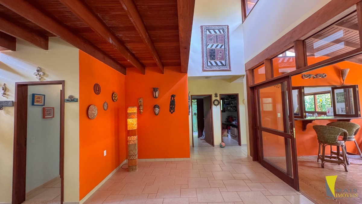 São 3 dormitórios, sendo 3 suítes(sendo 1suíte master com spa piso de cima), 1 banheiro, cozinha, sala de Tv, sala de jantar com lareira , área gourmet com churrasqueira e forno a lenha, piscina.